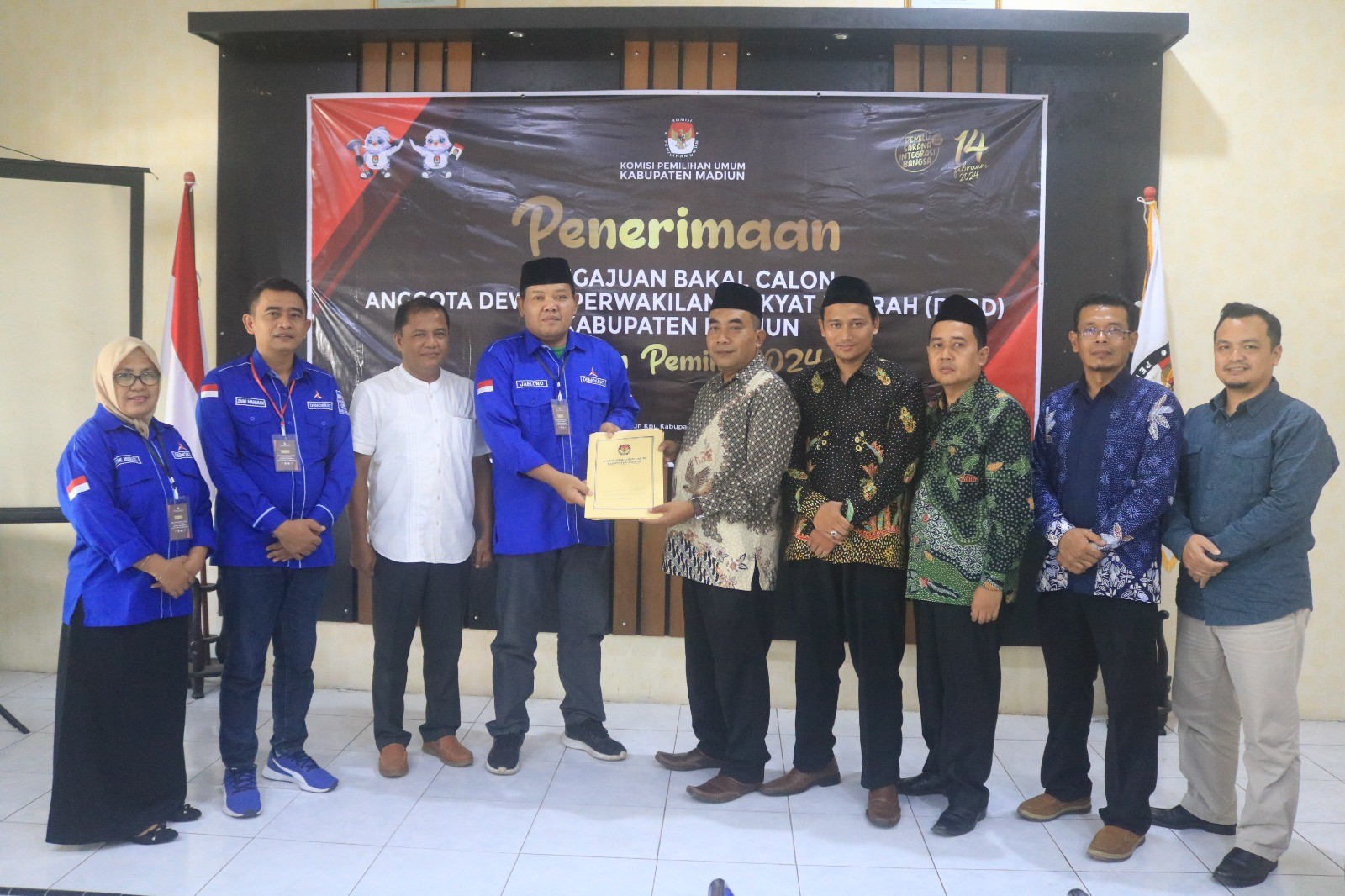 Ditemui langsung oleh Ketua KPU Kabupaten Madiun Ali Nur Wahyudi yang di dampingi oleh seluruh komisioner. Setelah pelaksanaan cek berkas untuk seluruh bakal calon DPRD yang mendaftar, dilakukan foto bersama untuk penyerahan Berita Acara dari KPU Kabupaten Madiun ke Partai Demokrat (PD) sebagai tanda bukti telah melakukan pendaftaran bakal calon.