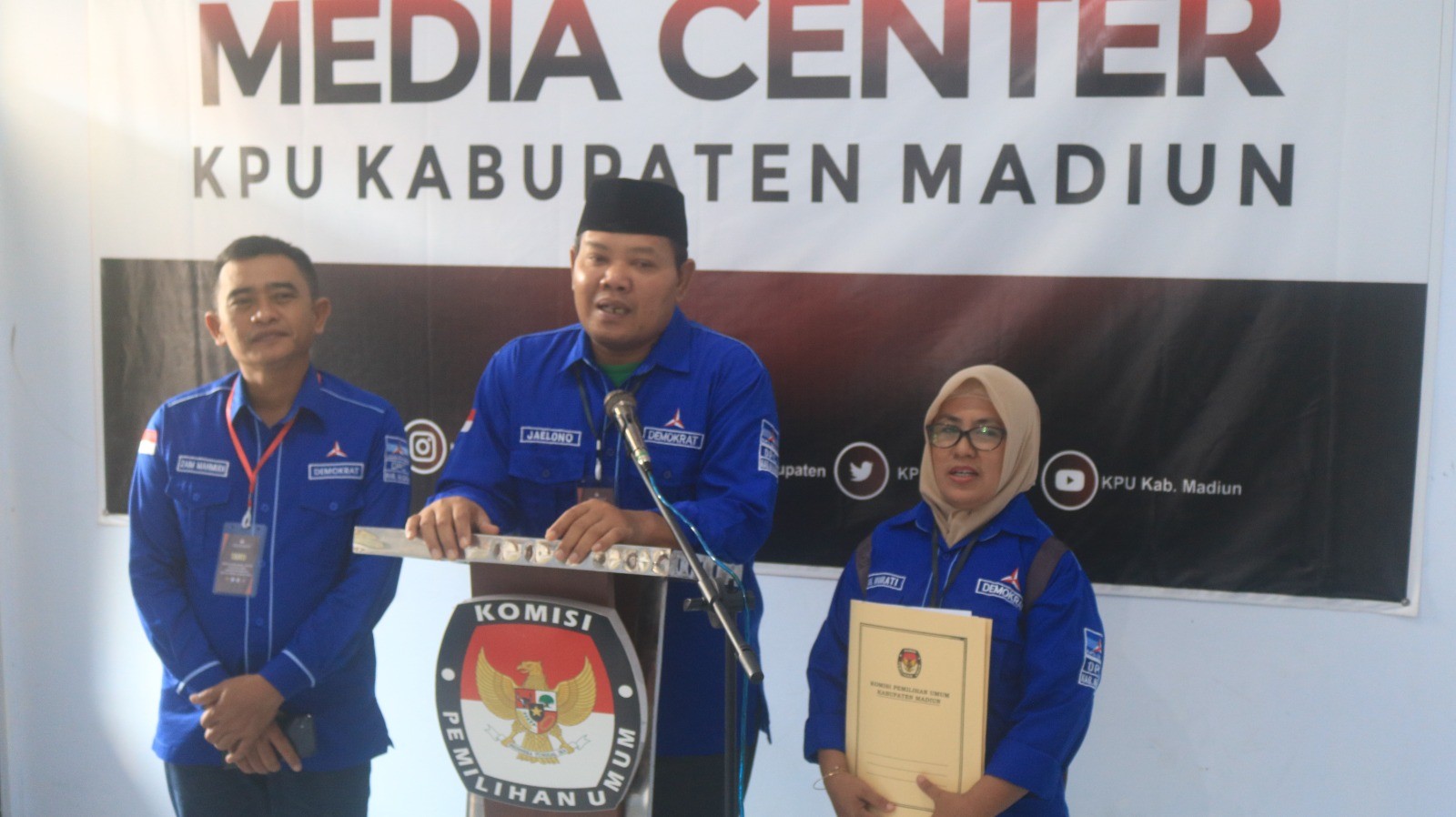Madiun, http://kab-madiun.kpu.go.id Jum’at 12 Mei 2023, 14.02 WIB Rombongan Dari Partai Demokrat (PD) ikut serta dalam pengajuan Bakal Calon DPRD Kabupaten Madiun datang untuk mendaftarkan calonnya ke Kantor KPU Kabupaten Madiun. Dalam rombongannya Partai Demokrat (PD) yang diketuai oleh H. AHMAD DAWAMI RAGIL SAPUTRO yang kebetulan tidak bisa hadir dan diwakili oleh Bakal Calon DPRD yang ikut serta mendaftar yakni Jaelono yang juga mendaftarkan seluruh bakal calonnya yang kemudian di cek langsung terkait dengan seluruh berkas pendaftaran oleh Operator SILON menurut dapilnya masing - masing.