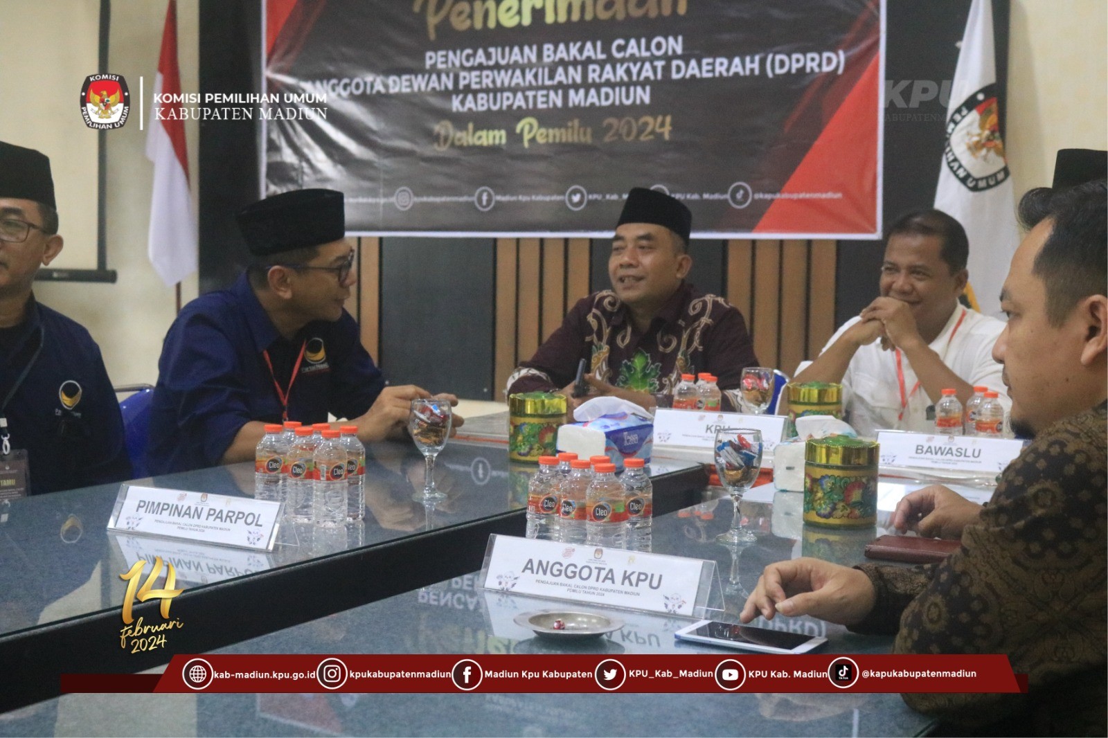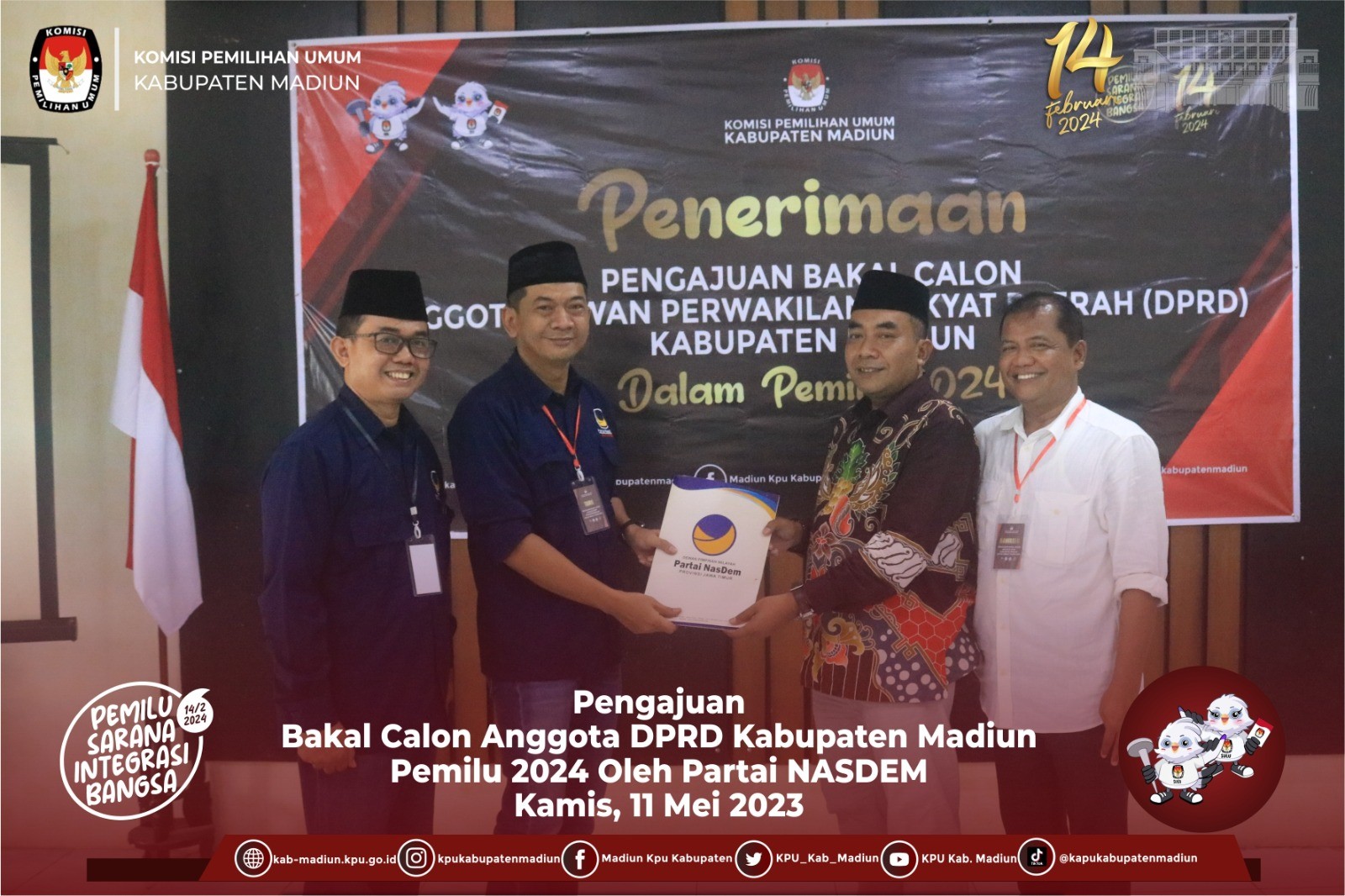 Ditemui langsung oleh Ketua KPU Kabupaten Madiun Ali Nur Wahyudi yang di dampingi oleh seluruh komisioner. Setelah pelaksanaan cek berkas untuk seluruh bakal calon DPRD yang mendaftar, dilakukan foto bersama untuk penyerahan Berita Acara dari KPU Kabupaten Madiun ke Partai Nasdem sebagai tanda bukti telah melakukan pendaftaran bakal calon.