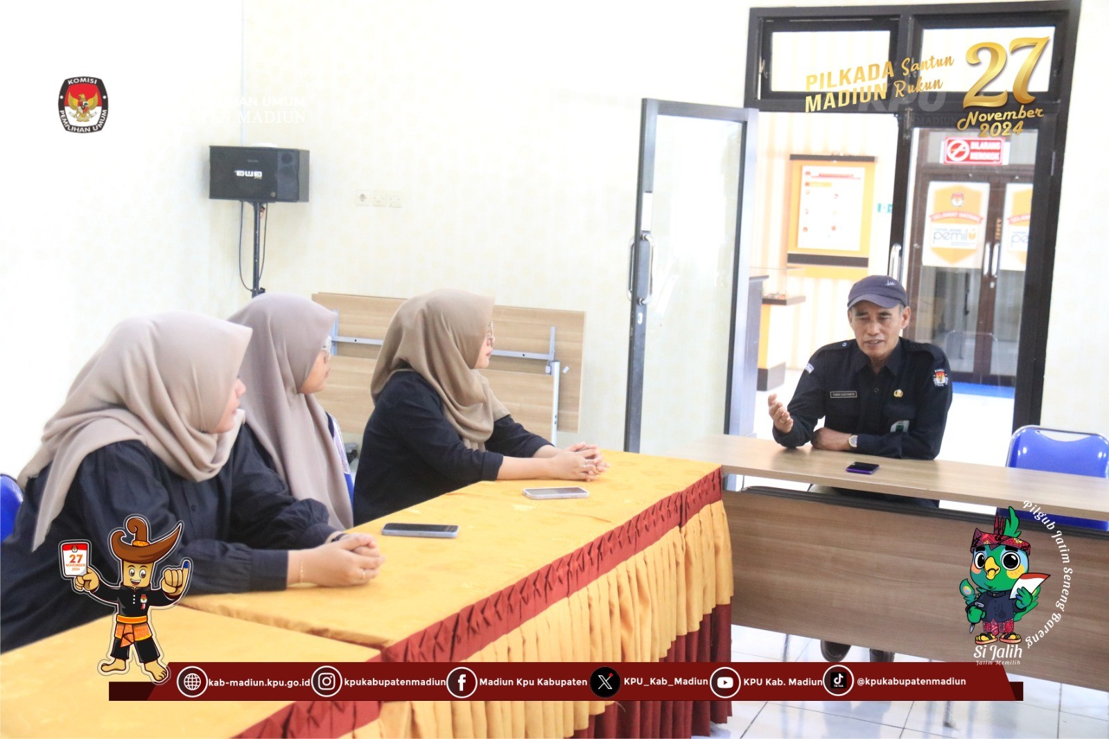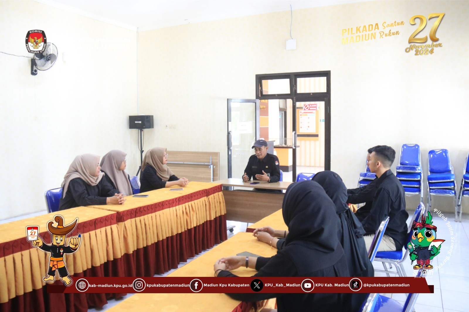 Madiun, http://kpu.kab-madiun.go.id Kamis, (24/7) Pelaksanaan Briefing dan sekaligus memberikan pengarahan kepada seluruh mahasiswa magang Universitas Merdeka Madiun dan Universitas Trunojoyo Madura yang dipimpin Subag Keuangan Umum dan Logistik Tamin Hariyanto dilaksanakan di Aula KPU Kabupaten Madiun.