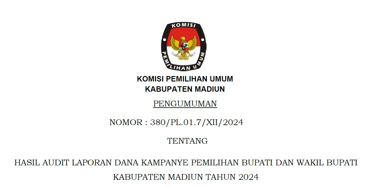 PENGUMUMAN HASIL AUDIT DANA KAMPANYE PEMILIHAN BUPATI DAN WAKIL BUPATI MADIUN