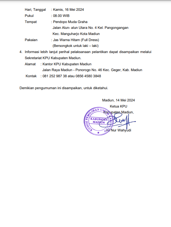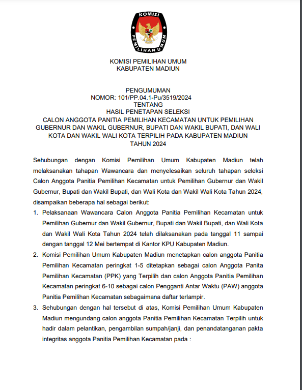 Madiun, http://kab-madiun.kpu.go.id Pengumuman Hasil Penetapan Calon Anggota PPK Terpilih untuk PILKADA 2024 . Komisi Pemilihan Umum Kabupaten Madiun mengundang calon anggota Panitia Pemilihan Kecamatan Terpilih untuk hadir dalam pelantikan, pengambilan sumpah/janji, dan penandatanganan pakta integritas anggota Panitia Pemilihan Kecamatan pada :