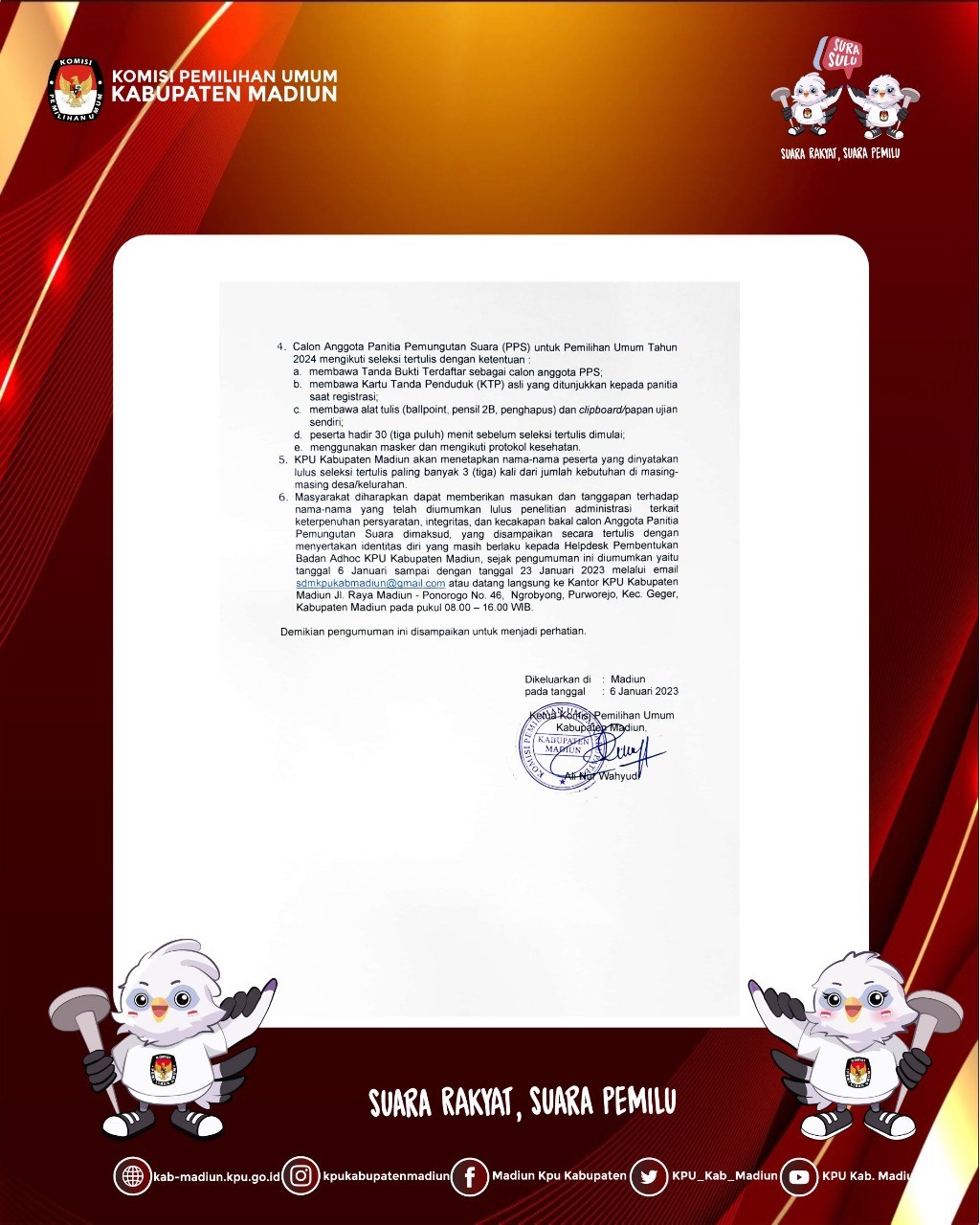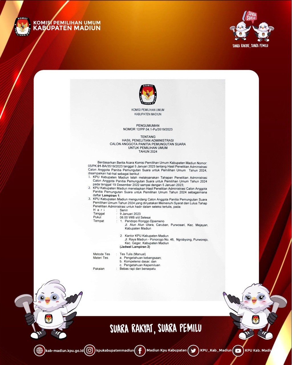 Madiun, http://kab-madiun.kpu.go.id Pengumuman Hasil Penelitian Administrasi Calon Anggota Panitia Pemungatan Suara (PPS) Untuk Pemilihan Umum Tahun 2024.