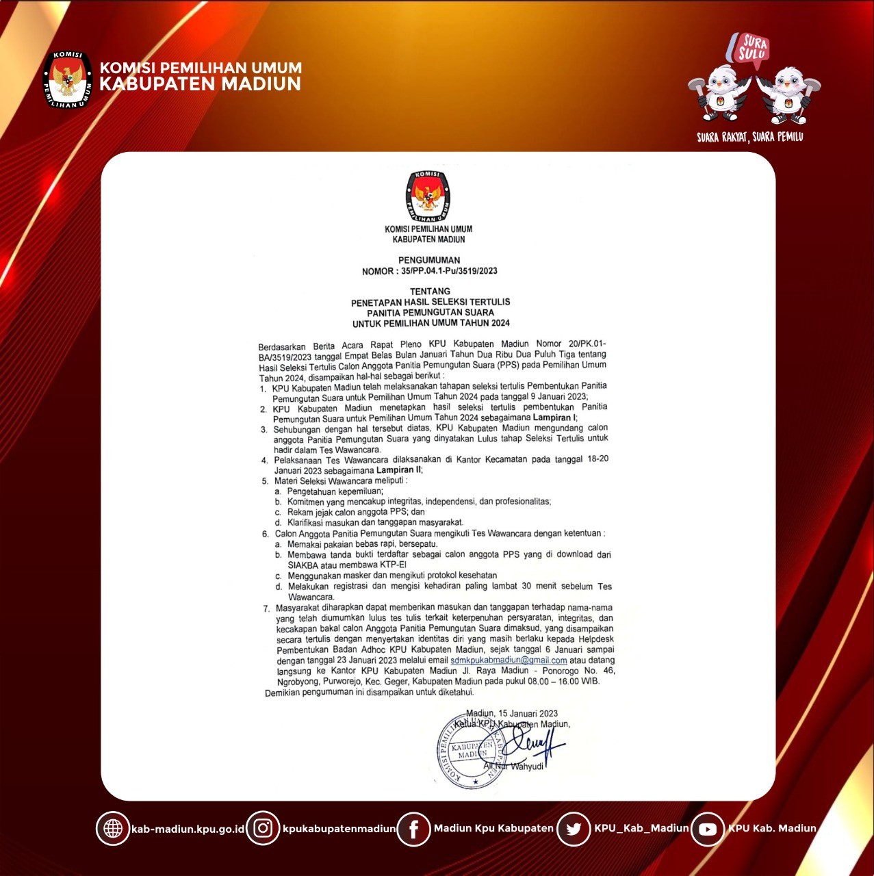 Madiun, http://kab-madiun.kpu.go.id Pengumuman Penetapan Hasil Seleksi Tertulis Calon Anggota Panitia Pemungutan Suara (PPS) Pemilu 2024.