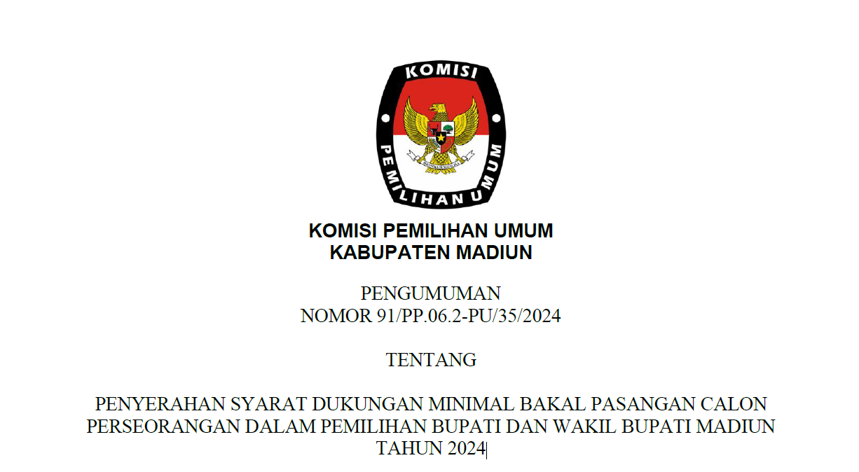 PENGUMUMAN PENYERAHAN SYARAT DUKUNGAN MINIMAL BAKAL PASANGAN CALON PERSEORANGAN DALAM PEMILIHAN BUPATI DAN WAKIL BUPATI MADIUN TAHUN 2024