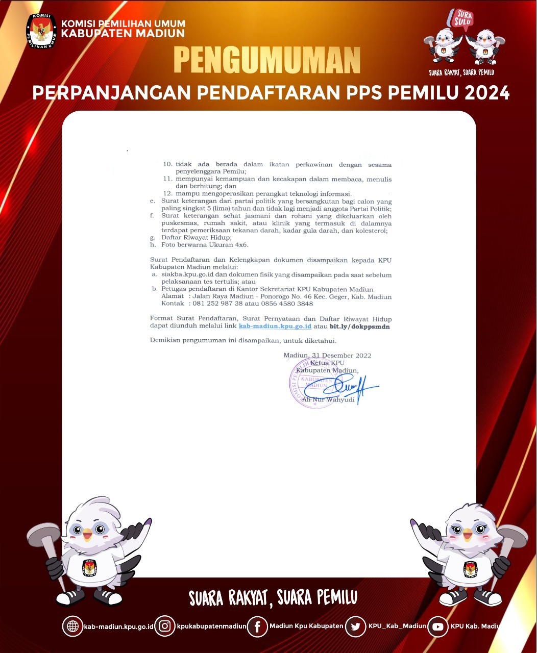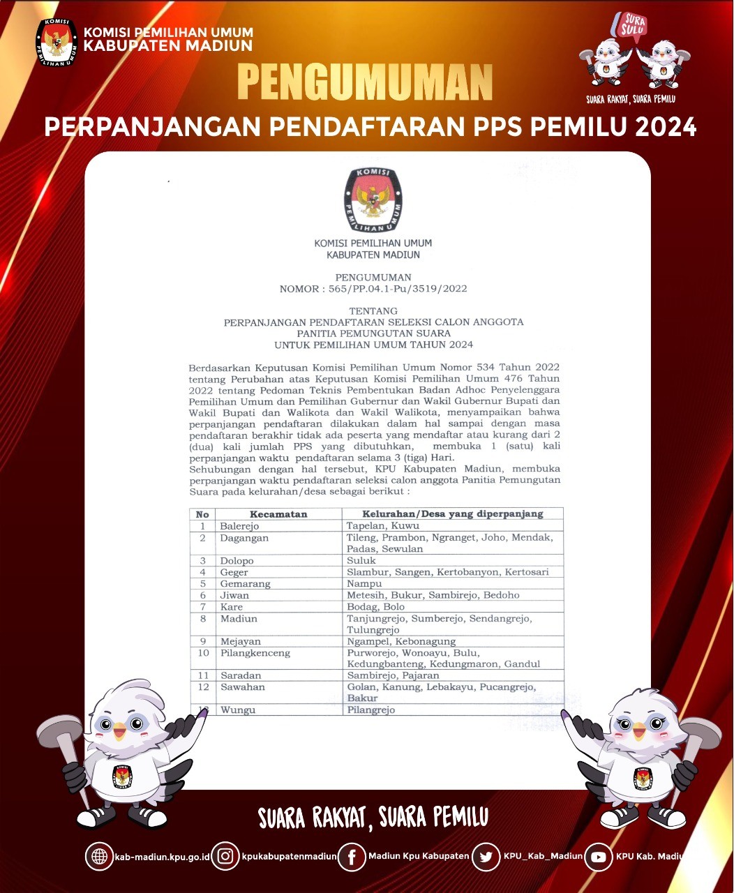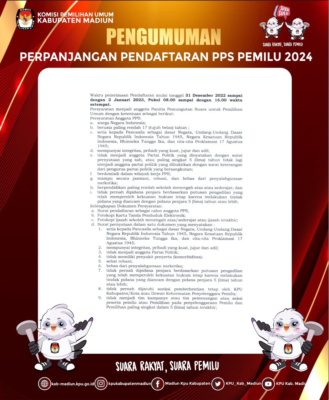 Pengumuman Perpanjangan Pendaftaran Sabtu, 31 Desember 2022 07:00 2062 Pengumuman Perpanjangan Pendaftaran PPS untuk Pemilu 2024. Berikut File Perubahan Pengumumannya bisa di download di sini. Sedangkan Perubahan Formulir pendaftaran bisa di download di sini. Bagikan: Telah dilihat 2,062 kali