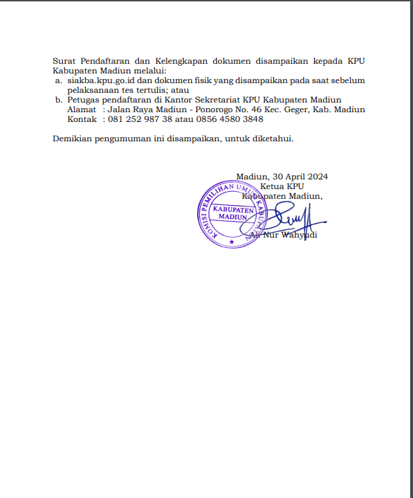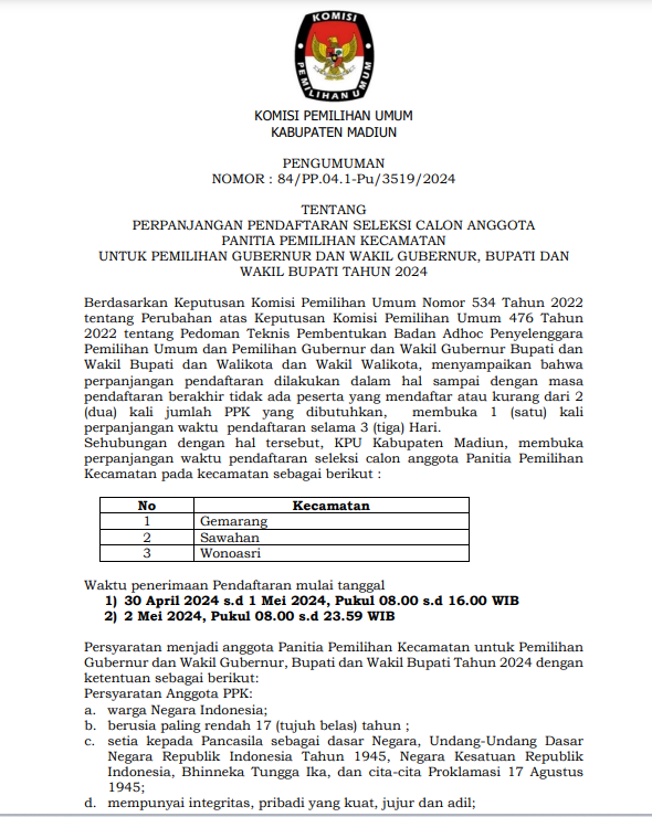 Pengumuman Perpanjangan Pendaftaran PPK KPU Kabupaten Madiun