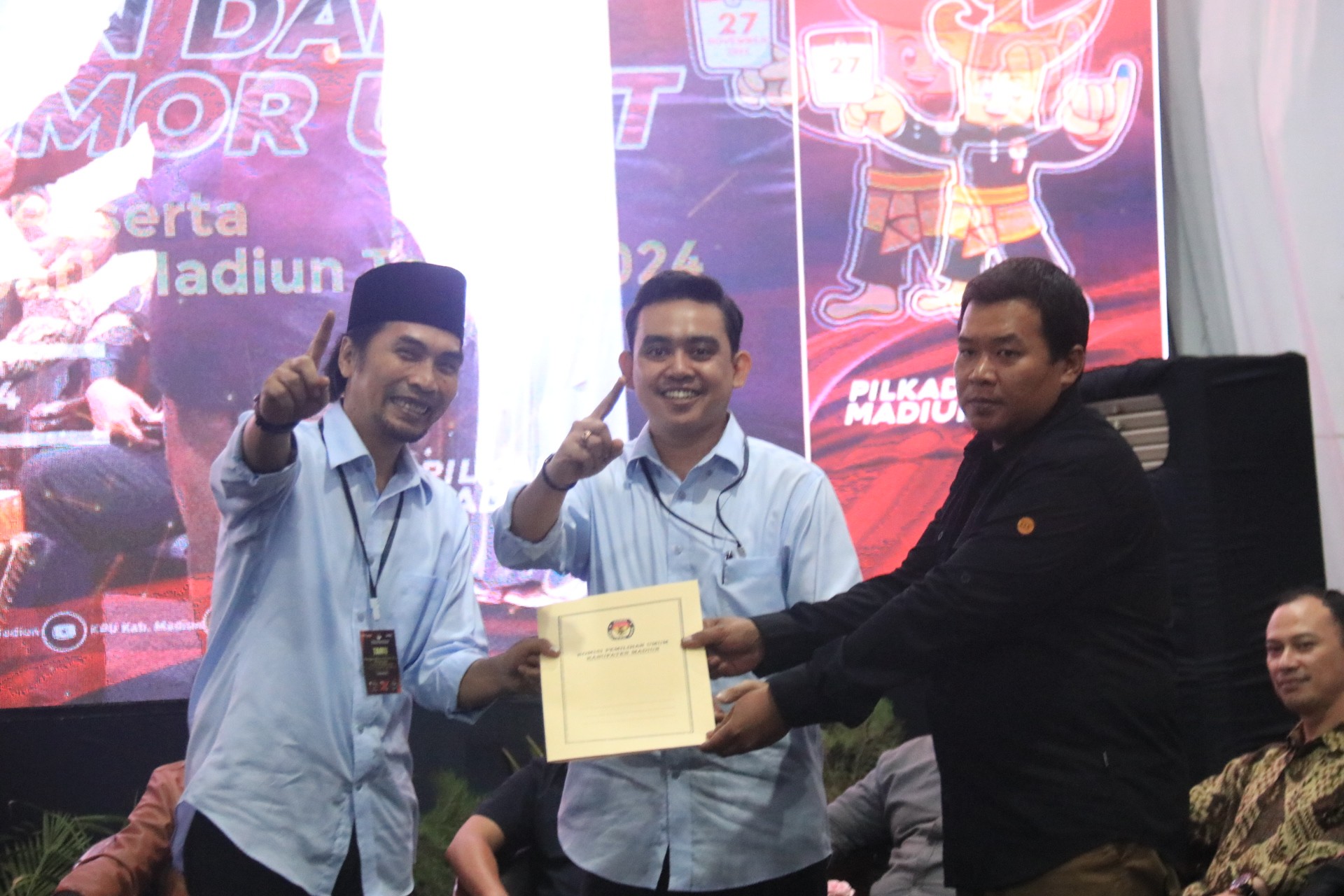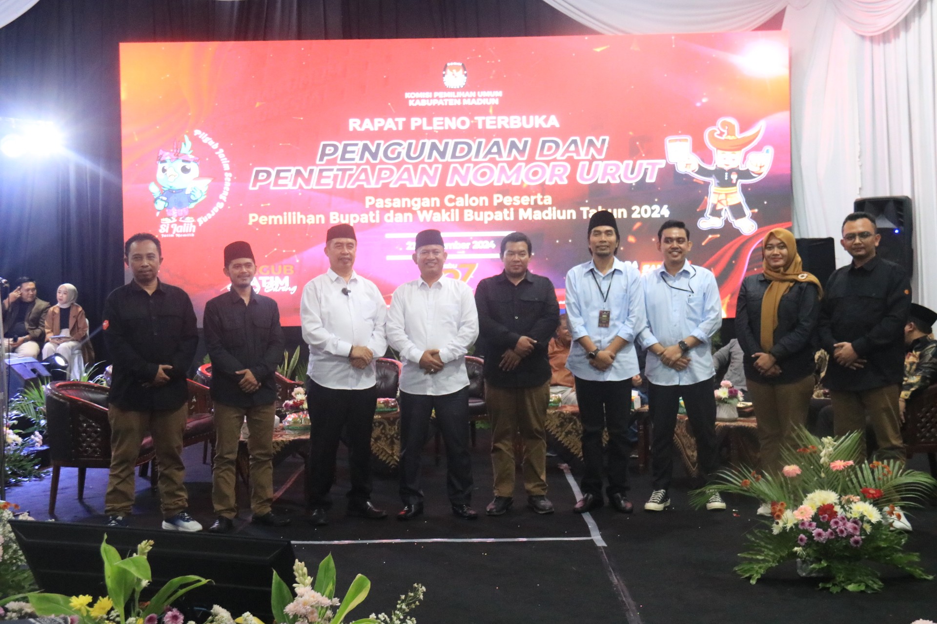 Di putuskan dalam Berita Acara yakni Setelah melakukan pengundian nomor urut dengan mendapat Nomor urutan ke- 1 yakni di pegang oleh Tim Madiun Menyala pasangan calon H. Ahmad Dawami dan Sandhika Ratna sedangkan Nomor urutan ke- 2 oleh Pasangan Calon Hari Wuryanto dan Dr. Purnomo Hadi. Penandatangan berita acara berikut Penyerahan Berita Acara kepada ke dua pasangan calon bupati dan wakil bupati madiun ini di sampaikan oleh Ketua KPU Kabupaten madiun Nur Anwar. setelah selesainya acara pengundian Nomor urut ini dilanjutkan ke esokan harinya nanti pada hari Rabu tanggal 25 September 2024 pada pukul 09.00 WIB akan dilaksanakan Penandatangan Deklarasi Damai Pilkada Madiun tahun 2024 yang akan di hadiri oleh Seluruh Forkopimda serta jajaran bawaslu Kabupaten Madiun dan TIM kemenganan pasangan calon. di Akhir Sesi acara pukul 11.00 Wib kegiatan pengundian nomor urut ini berjalan dengan lancar kemudian di tutup dengan foto bersama.
