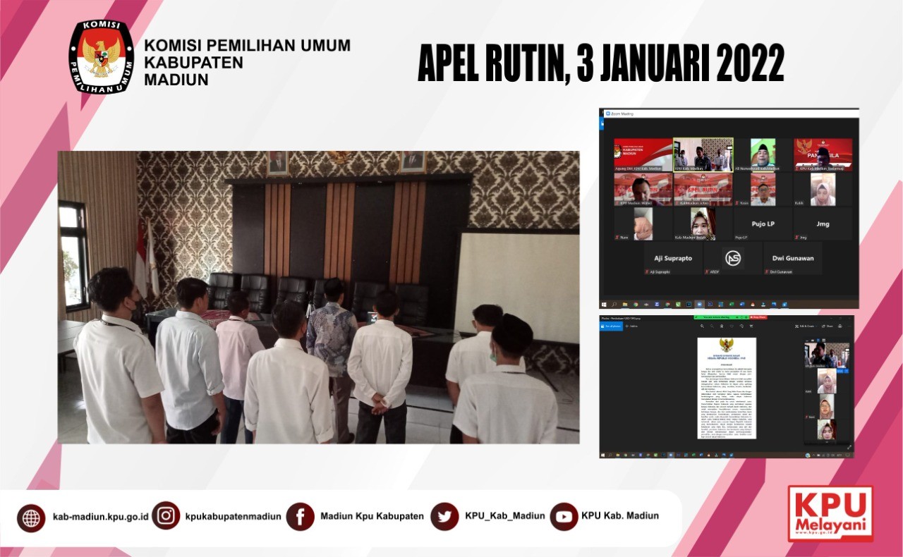 Madiun, http://kab-madiun.kpu.go.id Senin Pagi (03/01/2022), KPU Kabupaten Madiun Awali tahun baru 2022 dengan laksanakan Apel Pagi yang dimulai pukul 08.00 WIB. Dalam melaksanakan apel pagi ini di bagi menjadi 2 bagian, ada yang melaksanakan apel via zoom meeting dan luring yang berada dikantor. Ucapan Selamat Tahun Baru 2022 disampaikan oleh Komisioner Divisi Sosialisasi Pendidikan Pemilih, Partisipasi Masyarakat dan SDM Fahim Amrillah semoga kita semua selalu diberikan keselamatan dan kesehatan supaya bisa beraktifitas di tahun 2022 ini dengan meningkatkan kebersamaan dan kekompakan serta komunikasi demi kelancaran persiapan tahapan pemilu di tahun 2024. Fahim juga mengucapkan selamat kepada seluruh personel PPNPN yang bertugas kembali di KPU Kabupaten Madiun, diharapkan lebih ditingkatkan kinerjanya sesuai dengan aturan yang telah ditetapkan.