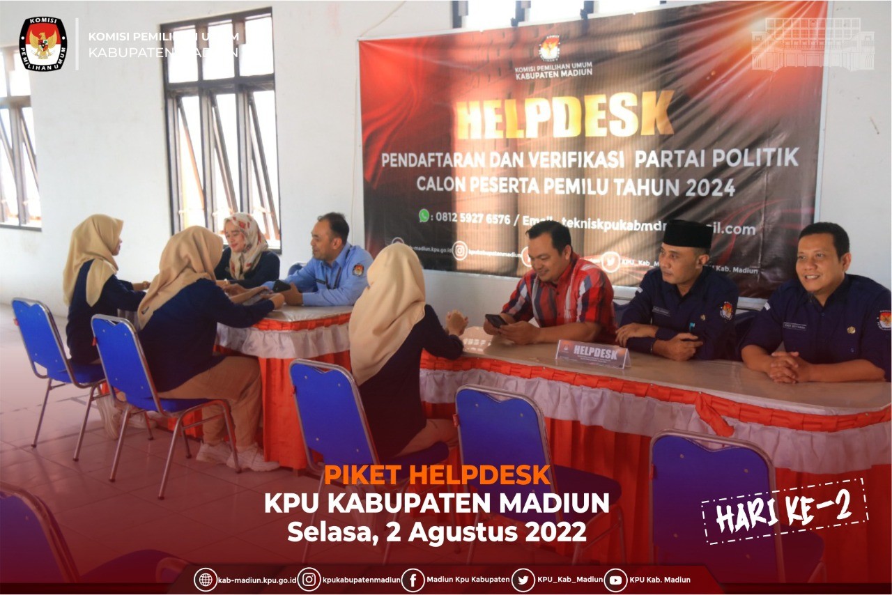 Madiun, http://kab-madiun.kpu.go.id Pelaksanaan Tahapan Pemilu Serentak Tahun 2024 sudah mulai berlangsung, pendaftaran Partai Politik sudah dilaksanakan di KPU RI mulai Tanggal 1 agustus 2022. Sesuai dengann arahan dan SOP yang telah ditentukan oleh KPU RI. KPU Kabupaten telah membentuk Tim Helpdesk Pendaftaran dan Verifikasi Partai Politik Calon Peserta Pemilu Tahun 2024, Tugas daripada Tim Helpdesk ini dimulai tanggal 1 Agustus s/d 14 Agustus 2022 pada jam 08.00 – 17.00 WIB, Seluruh Tim Helpdesk oleh Sekretaris KPU Kabupaten Madiun Agung Dwi Murdianto di tempatkan di Gedung Utara Kantor dengan tugas Menerima Partai Politik yang akan berkonsultasi. Ketua KPU Kabupaten Madiun Ali Nur Wahyudi juga mengamanatkan kepada seluruh petugas piket Helpdesk agar selama dalam bertugas harus sesuai dengan Undang-Undang dan PKPU yang berlaku.