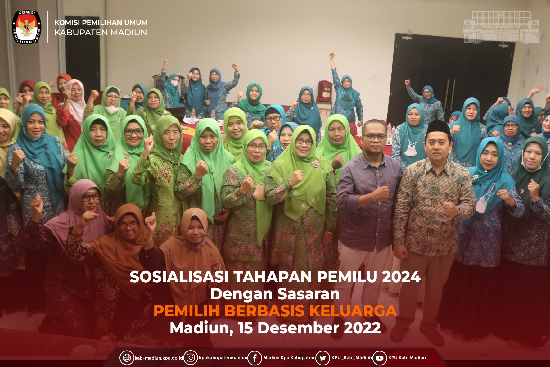 Madiun, https://kab-madiun.kpu.go.id "Tahapan Pemilu Sudah dimulai sejak bulan Juni 2022 lalu, diharapkan seluruhnya masyarakat Kabupaten Madiun ikut berpartisipasi dalam kelancaran setiap tahapan pemilu 2024", ujar Komisioner Divisi Hukum dan Pengawasan Tri Haryono saat pembukaan kegiatan Sosialisasi Tahapan Pemilu 2024 dengan sasaran Pemilih Berbasis Keluarga. Kegiatan yang dilaksanakan pukul 10.00 WIB bertempat di Ballroom Hotel Suncity Madiun, dihadiri oleh seluruh Organisasi di Kabupaten Madiun. yakni pentingnya Peran dari para Ibu-ibu PKK , Muslimat dan Aisyah yang termasuk sasaran utama dalam kelancaran pemilu nantinya yang berbasis keluarga.