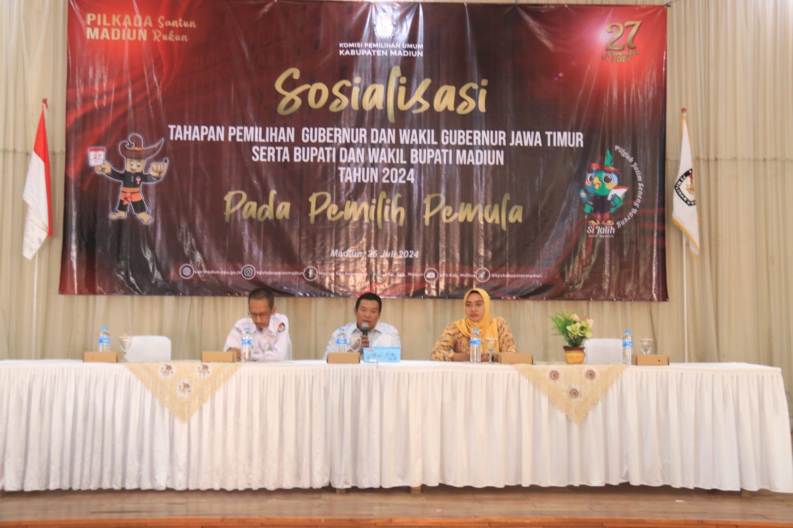 Madiun, http://kpu.kab-madiun.go.id KPU laksanakan kegiatan sosialisasi pemilih pemula, kegiatan tersebut dihadiri SMA/SMK seKabupaten Madiun dan dibuka oleh Ketua KPU Kabupaten Madiun Nur Anwar dan menyampaikan mengenai KPU memiliki tanggung jawab moral untuk meningkatkan partisipasi pemilih untuk membangun Kabupaten Madiun yang lebih baik dan segmentasi pemilih pemula, membangun persepsi guna memilih Kepala Daerah. Kamis,(25/7)