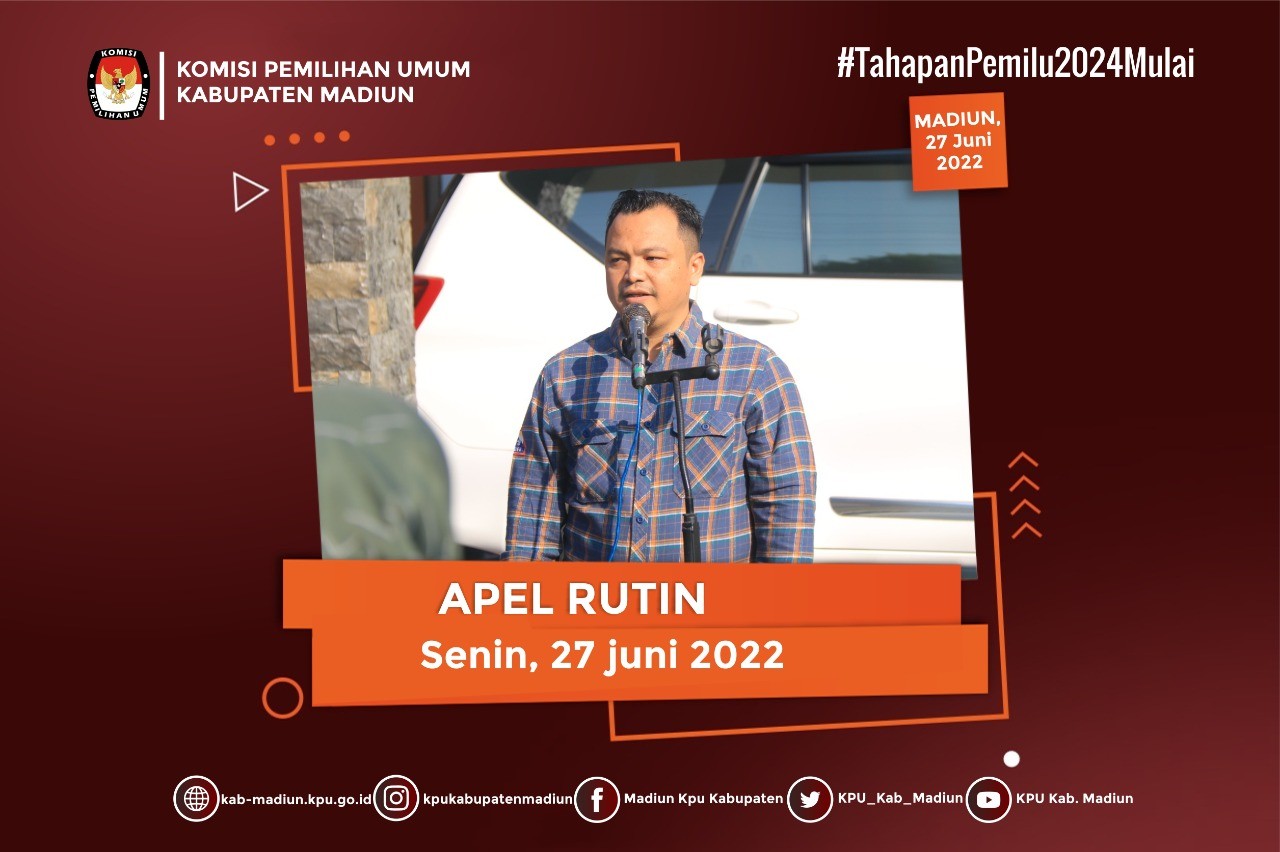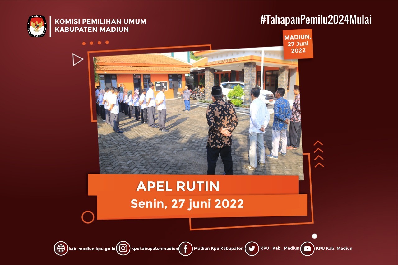 Madiun, http://kab-madiun.kpu.go.id Pagi ini pukul 08.00 WIB KPU Kabupaten Madiun laksanakan kegiatan apel pagi yang kali ini dipimpin oleh Komisioner Divisi Perencanaa Data dan Informasi Nur Wachid Nasrulloh. Kegiatan apel pagi ini di hadiri oleh Seluruh Personel KPU Kabupaten Madiun mulai dari Komisioner, Sekretaris serta Seluruh Staf Sekretariat.