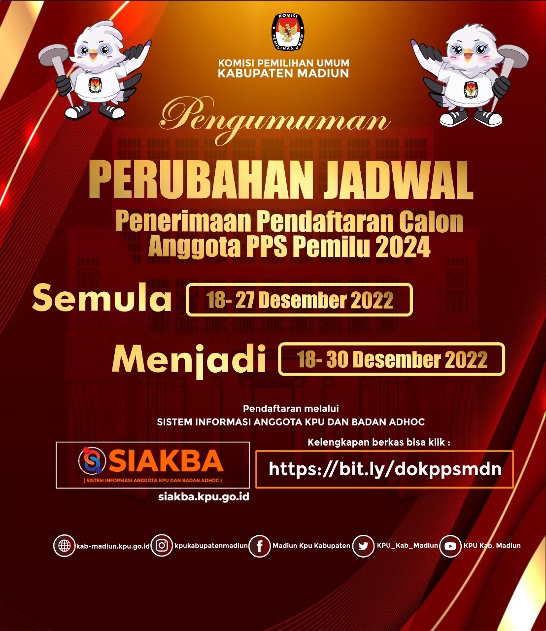 Perubahan Pengumuman Pendaftaran PPS Untuk Pemilu 2024 Jumat, 23 Desember 2022 08:00 2544 Perubahan Pengumuman Pendaftaran PPS untuk Pemilu 2024. Berikut File Perubahan Pengumumannya bisa di download di sini. Sedangkan Perubahan Formulir pendaftaran bisa di download di sini. Bagikan: Telah dilihat 2,544 kali