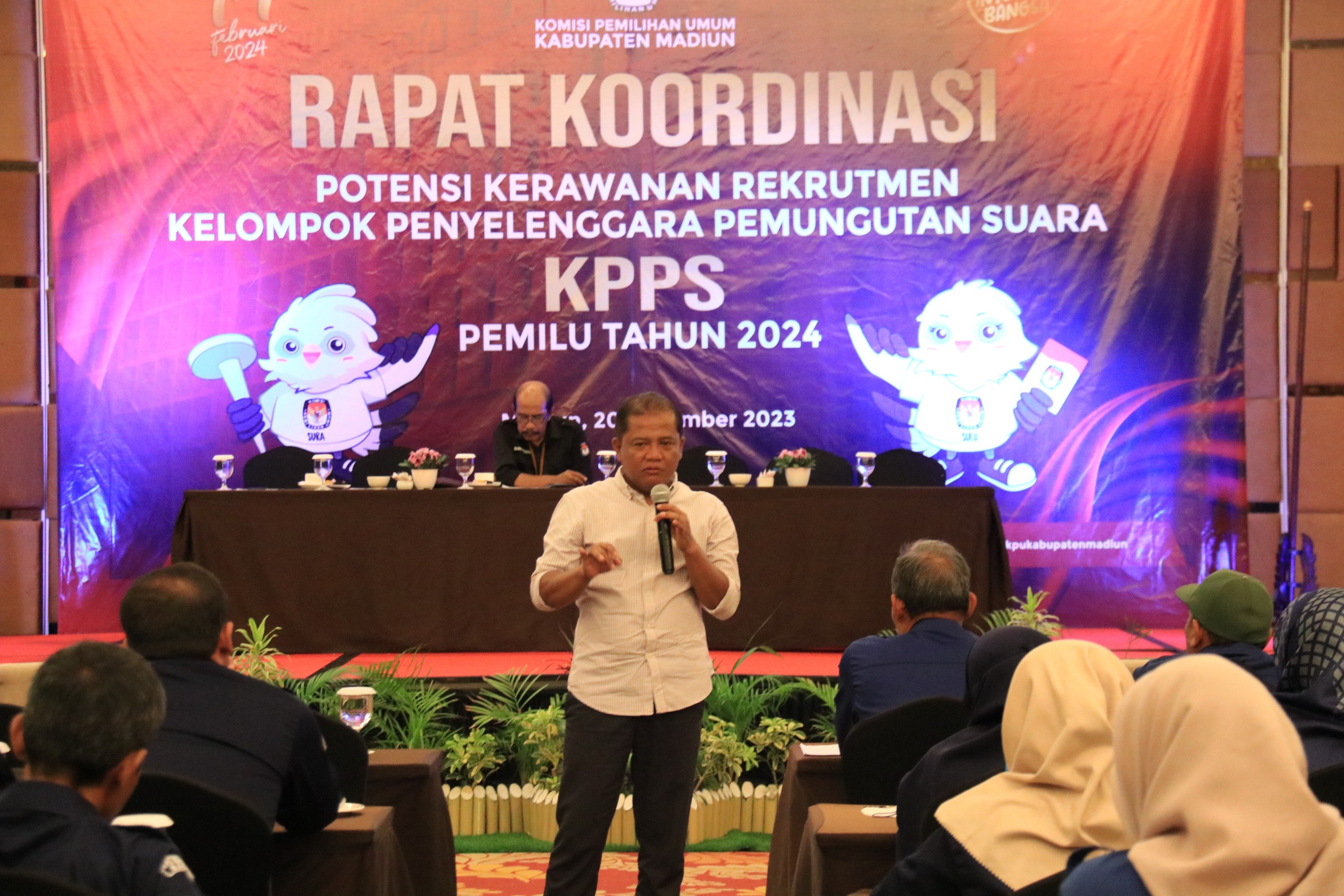 Madiun, http://kab-madiun.kpu.go.id KPU Kabupaten Madiun laksanakan kegiatan Rapat Koordinasi dengan Bawaslu Kabupaten Madiun dengan peserta Seluruh PPS Se Kabupaten Madiun. Pelaksanaan giat ini bertempat di Ballroom hotel Aston Kota Madiun yang dimulai pukul 09.00 WIB . Pembukaan Acara yang diawali oleh Komisioner Divisi Perencanaan Data dan Informasi Nur Wachid Nasrulloh yang didampingi oleh Komisioner Divisi Hukum dan Pengawasan Tri Haryono. juga turut hadir selaku Narasumber dari Bawaslu Kabupaten Madiun Slamet Widodo yang memberikan wawasan terkait Potensi pada Saat Rekrutmen KPPS dalam Pemilu 2024 ini. Dalam Seluruh rangkaian acara berjalan dengan lancar sampai dengan selesai Acara.