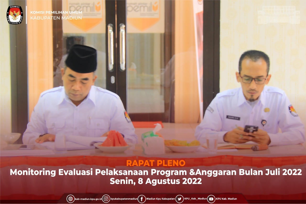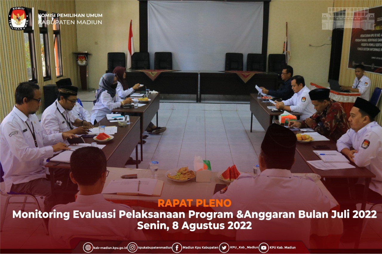 Madiun, http://kab-madiun.kpu.go.id KPU Kabupaten Madiun laksanakan kegiatan Rapat Pleno tentang Realisasi Anggaran Bulan Juli 2022. Giat rapat pleno pagi ini dihadiri oleh Seluruh Komisioner, Sekretaris dan seluruh Kepala Subbagian. Terkait dengan Penyampaian Laporan Realisasi Anggaran bulan Juli ini disampaikan langsung oleh Sekretaris KPU Kabupaten Madiun Agung Dwi Murdianto bahwasannya serapan anggaran yang mencapai 51,68% dari pagu yang ada, karena dalam penggunaan anggaran ini masih dibatasi. Selaku pimpinan Rapat Pleno ini Ketua KPU Kabupaten Madiun Ali Nur Wahyudi menyampaikan mohon diperhatikan terutama untuk dalam penyerapan anggaran dan juga pembuatan SPJ.