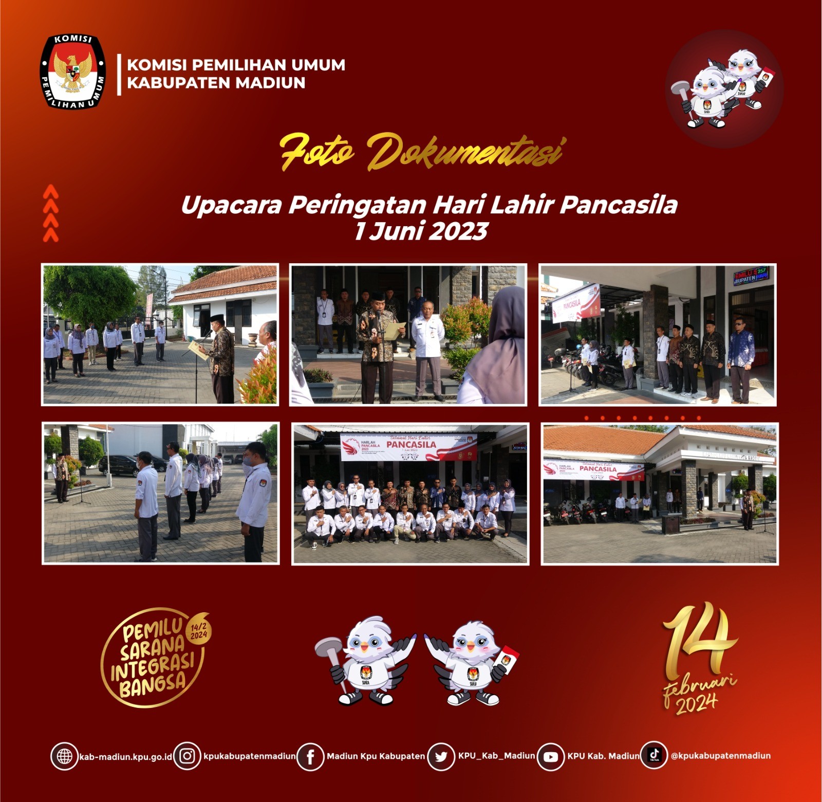 Madiun, http://kab-madiun.kpu.go.id Selamat Hari Lahir Pancasila 1 Juni 1945 - 1 Juni 2023. KPU Kabupaten Madiun laksanakan upacara Hari Lahir Pancasila. dengan Semangat Gotong Royong Membangun Peradaban dan Pertumbuhan Global.