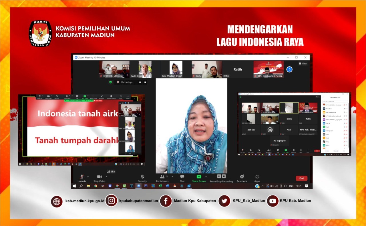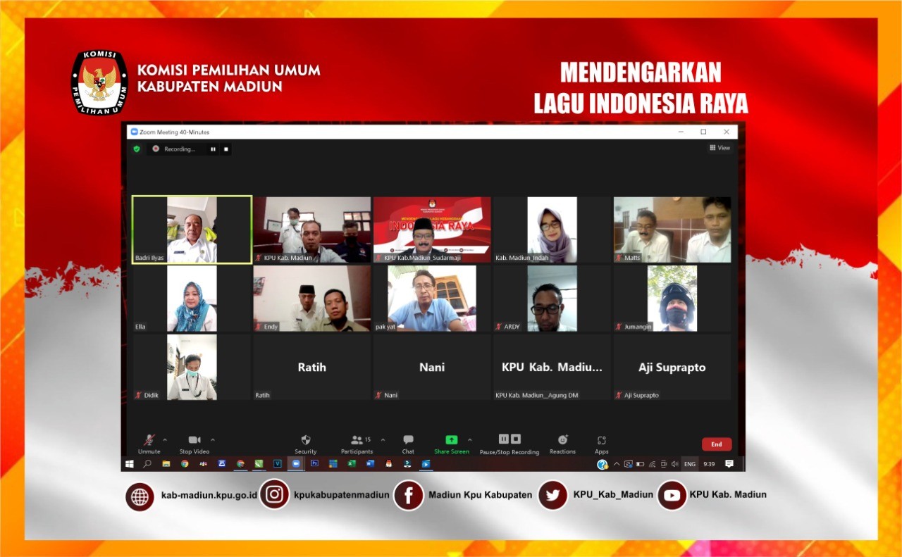 Madiun, http://kab-madiun.kpu..go.id Hari Ini Seluruh Personel KPU Kabupaten Madiun laksanakan kegiatan secara Daring yang dipimpin oleh Kepala Subbagian Keuangan Umum dan Logistik Retno Meylia Muslim. Kegiatan daring kali ini yakni Bersama sama mendengarkan Lagu Indonesia Raya yang pada setiap harinya dilaksanakan sebelum kegiatan perkantoran berlangsung. Retno menyampaikan guna kegiatan ini yakni untuk memupuk cinta terhadap negara indonesia dan menumbuhkan kedisiplinan dan kekompakan untuk kelancaran tugas dan tanggung jawab pada masing masing. Kegiatan yang mulai pukul 09.30 WIB ini di akhiri dengan doa sebelum laksanakan giat selanjutnya.