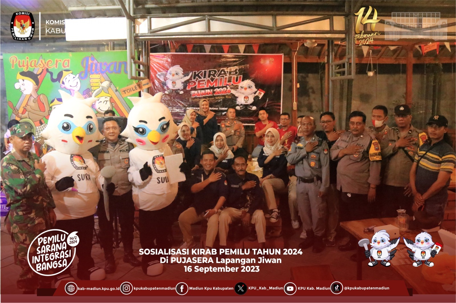 Madiun, http://kab-madiun.kpu.go.id Hari ini KPU Kabupaten Madiun laksanakan kegaitan sosialisasi Kirab Pemilu di hari ke 4 yang dilaksanakan di Lapangan Pujasera Jiwan Kabupaten Madiun mulai pukul 19.00 WIB. Ikut hadir dalam kegiatan sosialisasi ini Komisioner Divisi Sosialisasi Pendidikan Pemilih , Partisipasi Masyarakat dan SDM Fahim Amrillah dan Komisioner Divisi Hukum dan Pengawasan Tri Haryono dan juga ikut datang dari jajaran Sekretariat KPU Kabupaten Madiun serta PPK dan PPS Jiwan , Kapolsek berserta jajarannya dan Koramil, beserta maskot KPU Boneka Sura Sulu