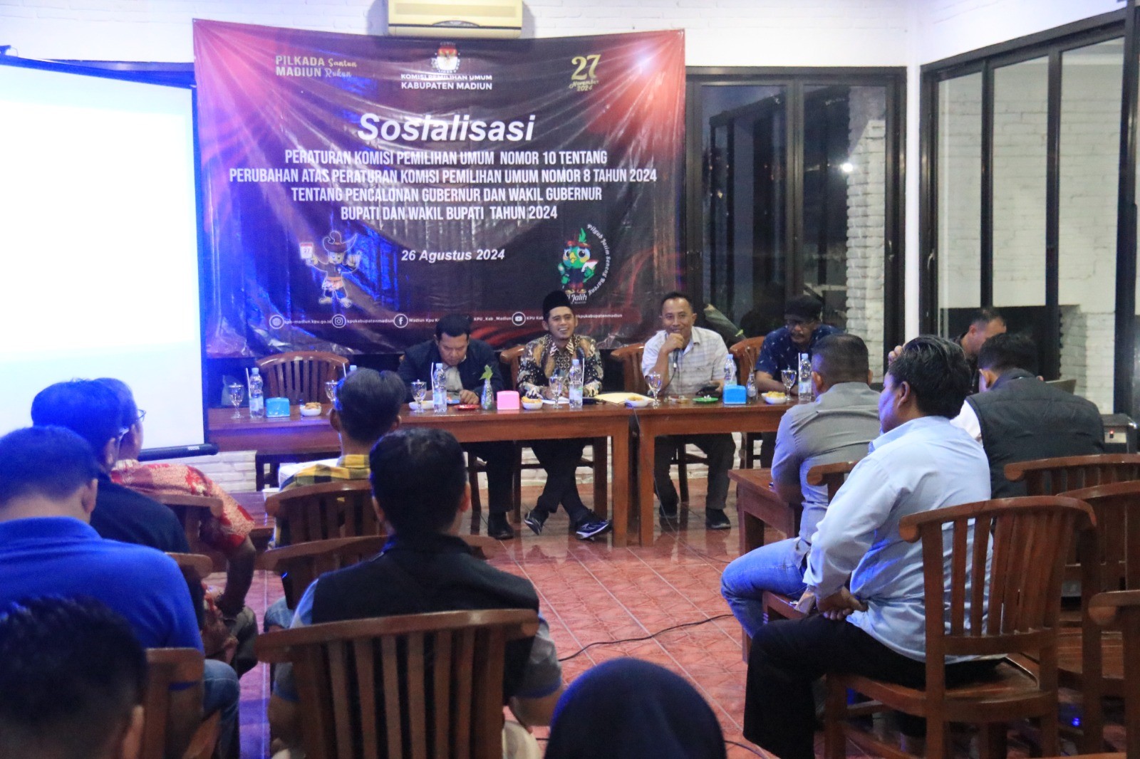 Dalam kegiatan ini turut hadir untuk membuka acara sosialisasi yakni Ketua KPU Kabupaten Madiun Nur Anwar yang didampingi oleh seluruh Anggota Komisioner. Dalam penyampaian Sosialisasi PKPU no 10 tentang perubahan atas PKPU No. 8 tentang Pencalonan Gubernur dan Wakil Gubernur, Bupati dan Wakil Bupati tahun 2024 oleh Komisioner Divisi Teknis Penyelenggaraan Lutfi Al'as'ary dan juga dilanjutkan oleh penyampaian dari Komisioner Divisi Hukum dan Pengawasan Muhammad Wakhid Hasyim. Diakhir acara sedikit diskusi serta tanya jawab dengan seluruh peserta acara sosialisasi ini terkait dengan pelaksanaan pendaftaran bakal calon bupati dan wakil bupati tahun 2024