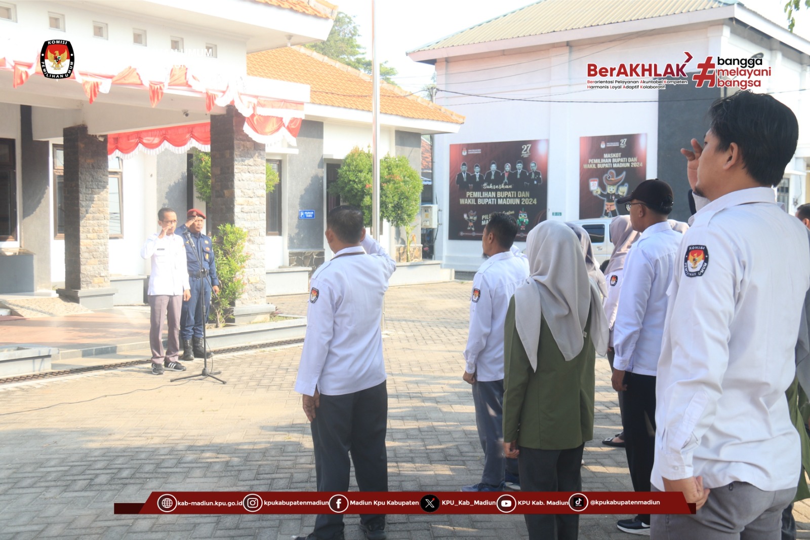 Madiun – Komisi Pemilihan Umum Kabupaten Madiun pekan ini kembali menggelar kegiatan apel pagi di halaman kantor KPU yang berada di jalan raya Madiun – Ponorogo, Purworejo, Geger, Madiun. Kegiatan tersebut merupakan acara rutin yang digelar oleh KPU kabupaten Madiun setiap hari Senin. Apel dimulai dari jam 08.00 sampai sekitar jam 08.30 pagi tersebut berjalan dengan tertib dan khidmat.