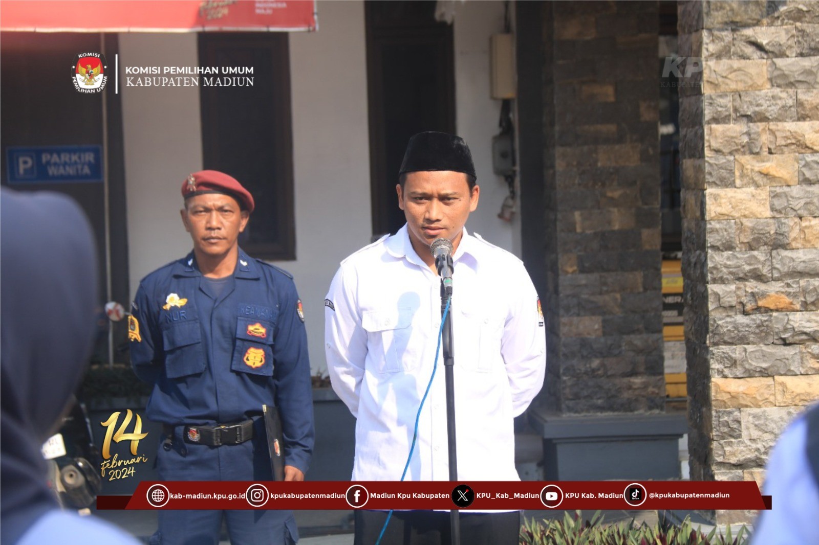 Dalam Amanat Apel Pagi kali ini Jumangin menyampaikan terkait dengan giat divisi teknis sudah selesai masa penetapan DCS (Daftar Calon Sementara). Selain itu Jumangin juga menyampaikan terkait dengan Kegiatan Kirab Pemilu 2024 diharapkan untuk seluruh personel KPU Kabupaten Madiun selalu siap dengan persiapan pelaksanaan Kirab Pemilu 2024. Nantinya dalam pelaksanaan Kirab Pemilu ini dari KPU Kabupaten Madiun akan menerima serah terima dari KPU Kabupaten Jombang, diharapkan dalam pelaksanaannya Tetap Jaga koordinasi dengan PPK dan PPS untuk ikut memeriahkan kegiatan Kirab Pemilu 2024.