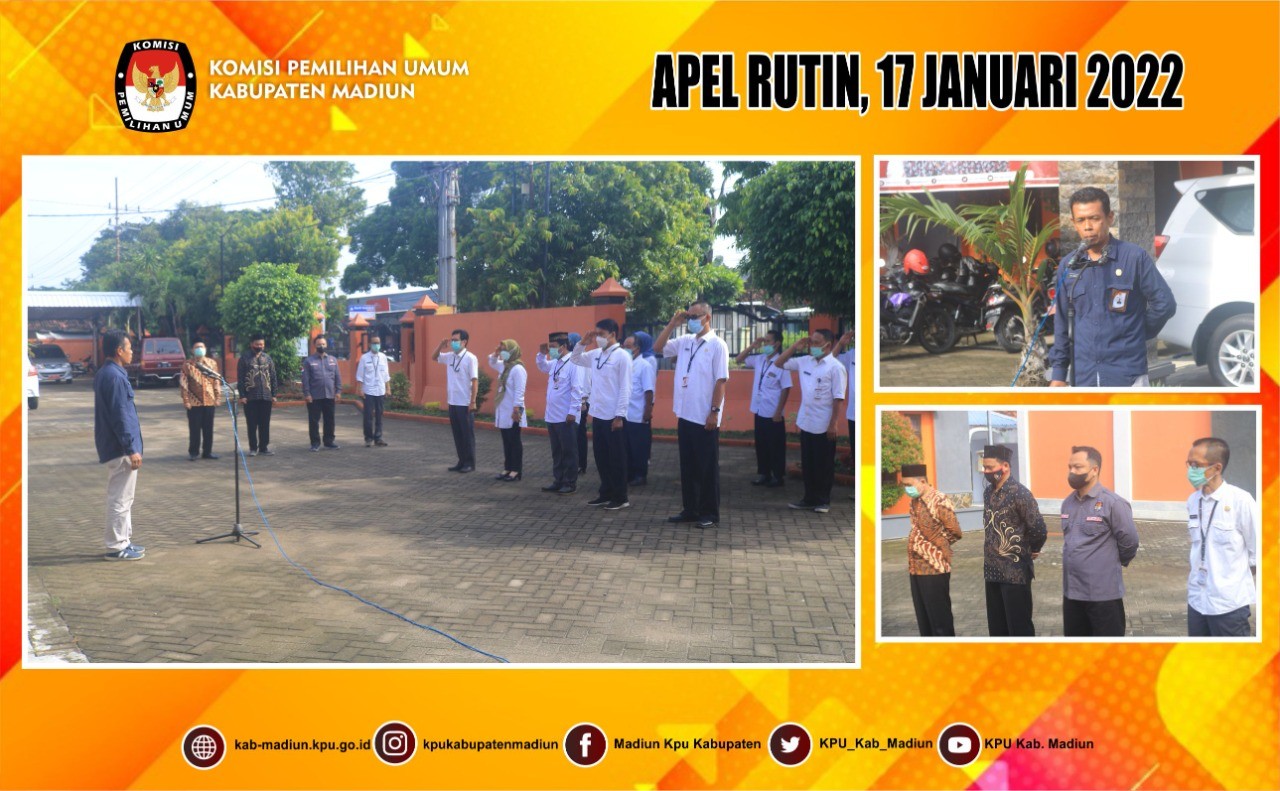 Madiun, http://kab-madiun.kpu.go.id Hari ini pukul 08.00 WIB, KPU Kabupaten Madiun laksanakan Apel Rutin Hari Senin yang dihadiri oleh seluruh Komisioner dan Seluruh Staf Sekretariat KPU Kabupaten Madiun, setelah beberapa bulan lalu tidak bisa melaksanakan karena kendala covid yang masih melanda Kabupaten madiun. Apel Rutin kali ini dipimpin oleh Komisioner Divisi Hukum dan Pengawasan Tri Haryono yang menyampaikan bahwasannya masa pandemi masih belum berakhir, mari senantiasa saling menjaga kesehatan dan lebih berhati hati lagi terhadap varian virus baru yang memasuki indonesia khususnya di wilayah kabupaten madiun saat ini.