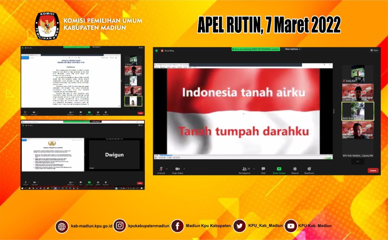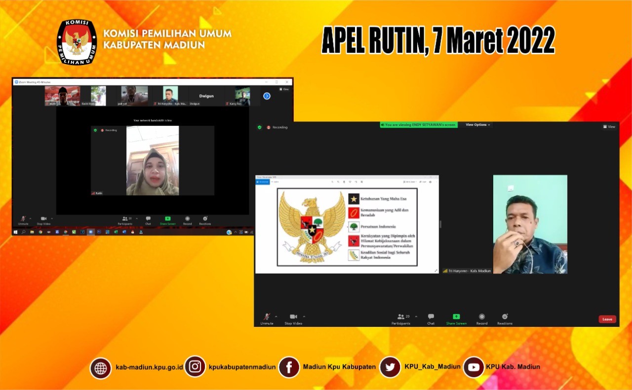 Madiun, http://kab-madiun.kpu.go.id "Mari saling menjaga sinergitas untuk memasuki tahapan pemilu serentak 2024" ujar Komisioner Divisi Hukum dan Pengawasan Tri Haryono saat memimpin Apel Rutin Hari Senin. Kali ini Apel Rutin dilaksanakan secara Daring yang dimulai pukul 09.00 WIB dan dihadiri oleh seluruh personel KPU Kabupaten Madiun baik yang sedang laksanakan WFH maupun WFO. Dalam Amanatnya Tri menyampaikan bahwasannya KPU Kabupaten Madiun sebagai Satker Penyelenggara Pemilu untuk lebih mempersiapkan seluruh kebutuhan Pemilu , karena Pemilu Serentak 2024 ini akan berbeda dengan Pemilu yang dilaksanakan tahun 2019 kemarin. walaupun ada wacana terkait diundurnya Pemilu 2024, namun sampai saat ini masih sekedar wacana , yang pasti kita sebagai satker penyelenggara pemilu harus tetap mematuhi aturan yang sudah ditetapkan. Tri menambahkan bahwasanya pentingnya kesiapan untuk saling evaluasi dan instrospeksi diri serta tetap menjaga komunikasi segala kesulitan apapun nantinya akan bisa diselesaikan.