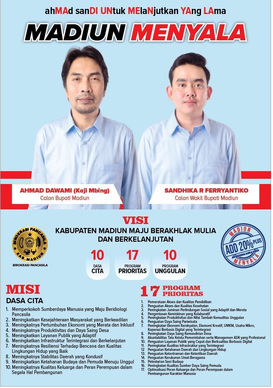 VISI MISI PASLON MADIUN MENYALA Sabtu, 14 September 2024 07:00 109 VISI MISI DAN PROGRAM MADIUN MENYALA Dapat di unduh di sini. Bagikan: Telah dilihat 109 kali