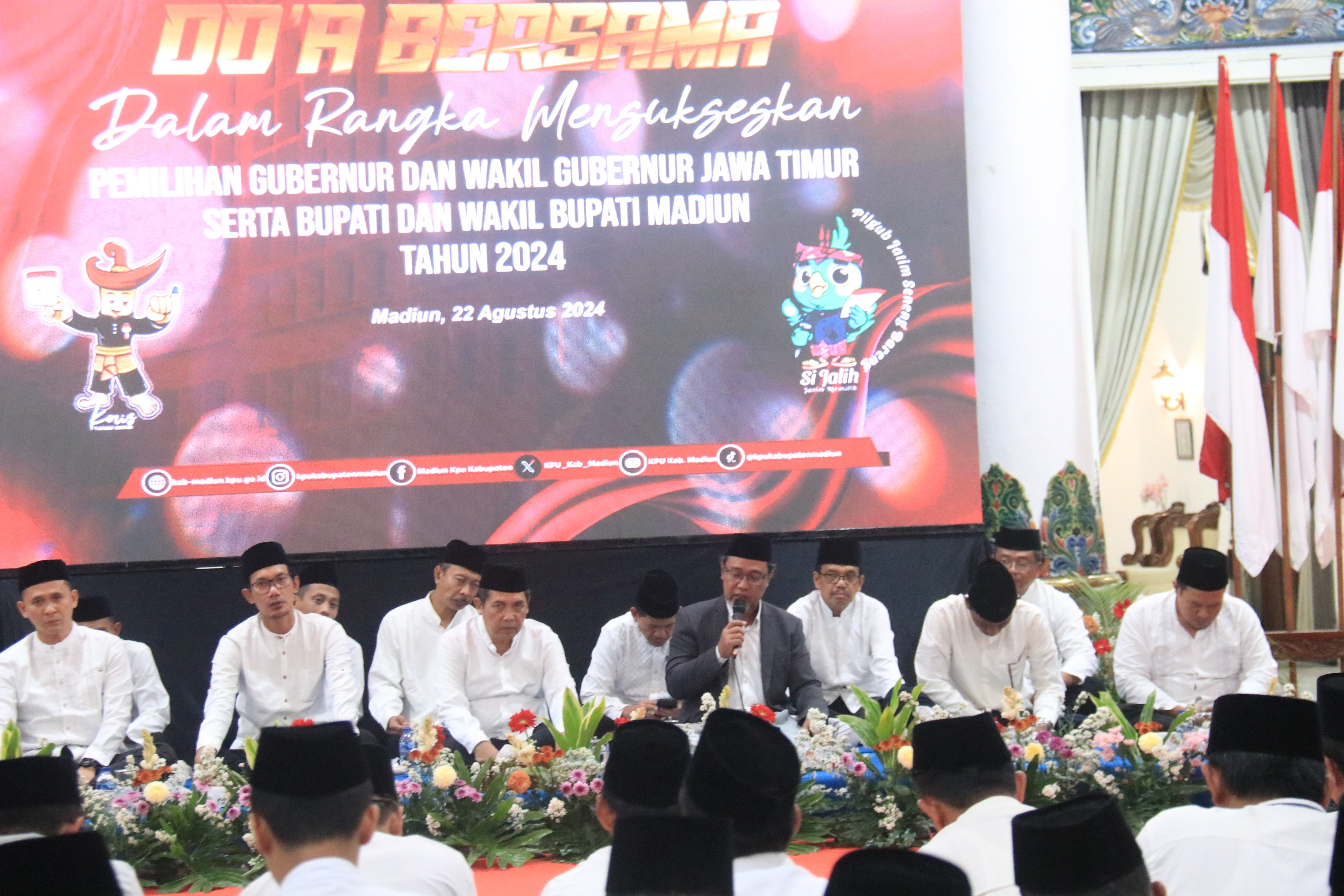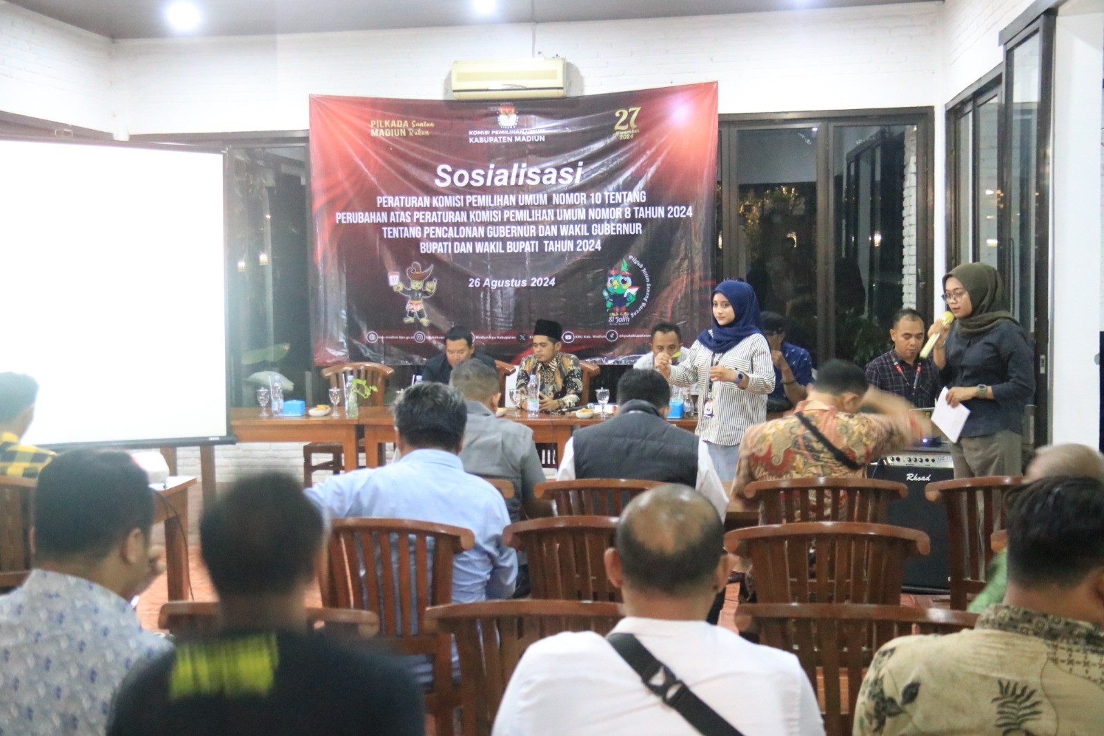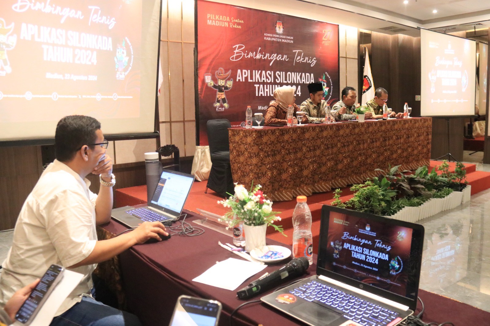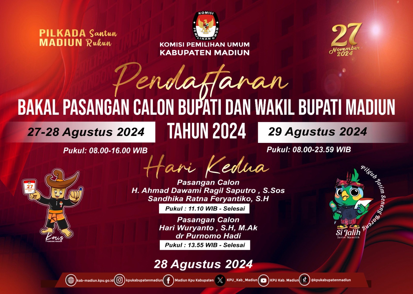 Madiun, http://kab-madiun.kpu.go.id Hari ke 2 Pendaftaran Calon Bupati dan Wakil Bupati Madiun Tahun 2024, Dua Pasangan Calon Bupati dan Wakil Bupati Madiun 2024 yakni Ahmad Dawami-Sandhika Ferryantoko (Madiun Menyala) dan Hari Wuryanto-Purnomo Hadi (Harmonis) beserta seluruh pendamping dari Partai Politik Pengusung Bakal Calon Bupati dan Wakil Bupati di terima pendaftarannya langsung oleh KPU Kabupaten Madiun. Prosesi Pengalungan Syal Selamat Datang di berikan oleh Sekretaris KPU Kabupaten Madiun Agung Dwi Murdianto yang dilanjut mengantarkan ke tempat Acara. Ketua KPU Kabupaten Madiun Nur Anwar beserta Anggota KPU Kabupaten Madiun menerima dengan baik seluruh berkas pendaftaran Bakal Calon yang dilanjutkan cek berkas kelengkapan oleh Operator SILON KPU Kabupaten Madiun yang didampingi oleh Bawaslu Kabupaten Madiun. Seluruh proses pendaftaran ini berlangsung dengan baik dan lancar serta cek berkas yang lengkap. Setelah selesainya pengecekan berkas dilanjutkan pemberian Cindera Mata dari KPU Kabupaten Madiun kepada Dua Bakal Pasangan Calon Bupati dan Wakil Bupati tahun 2024 tersebut.