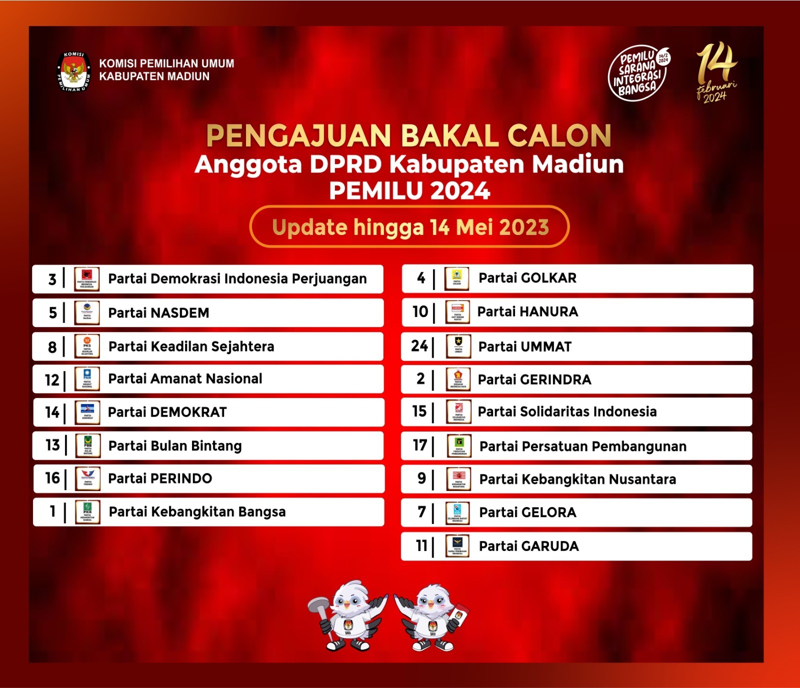 Madiun, http://kab-madiun.kpu.go.id Minggu 14 Mei pukul 23.59 Penerimaan Pendaftaran Bakal Calon Anggota DPRD Kabupaten Madiun Resmi ditutup. Dengan hasil 17 Partai Politik yang mendaftarkan pengajuannya ke KPU Kabupaten Madiun total bakal calon mencapai 709 Calon.