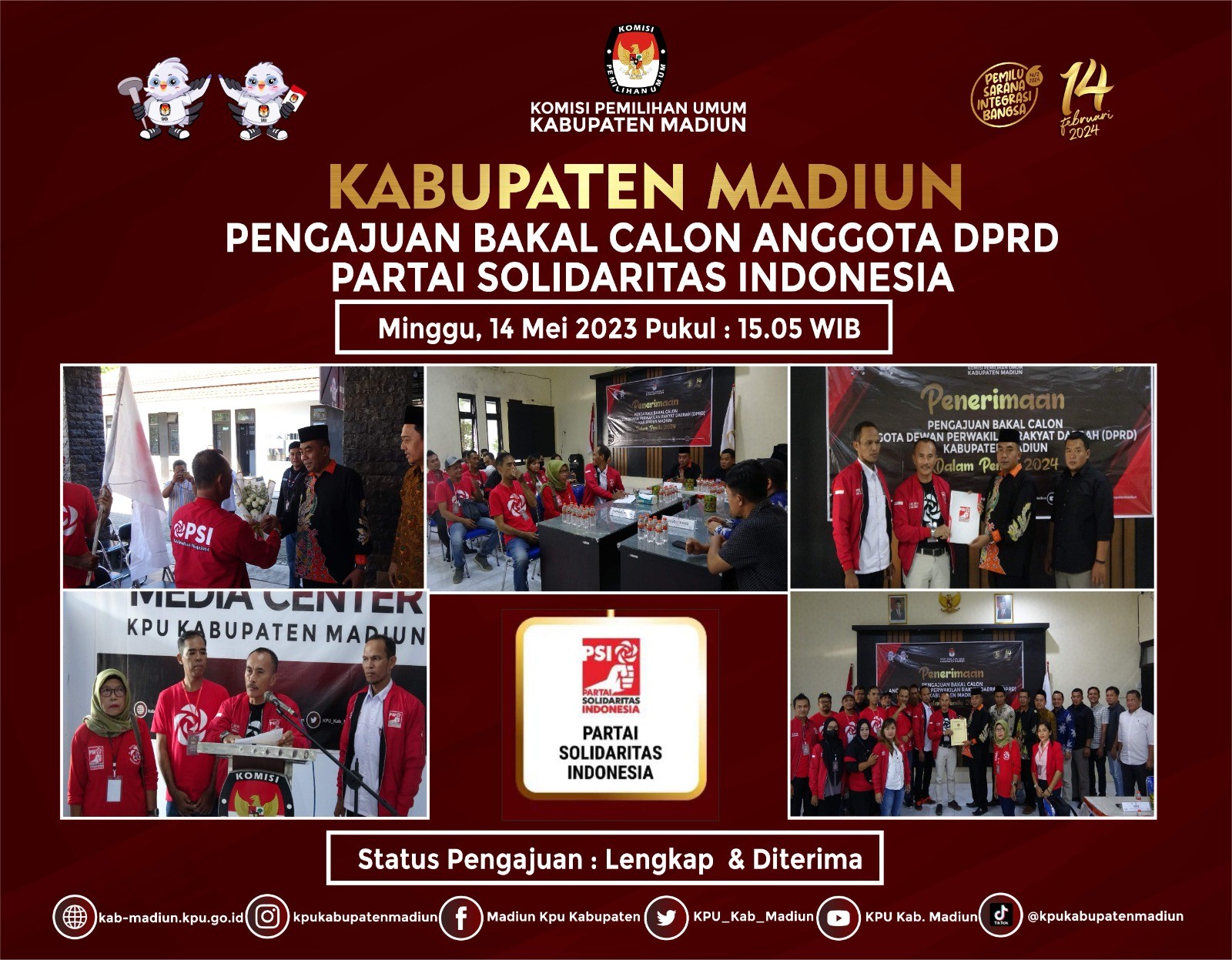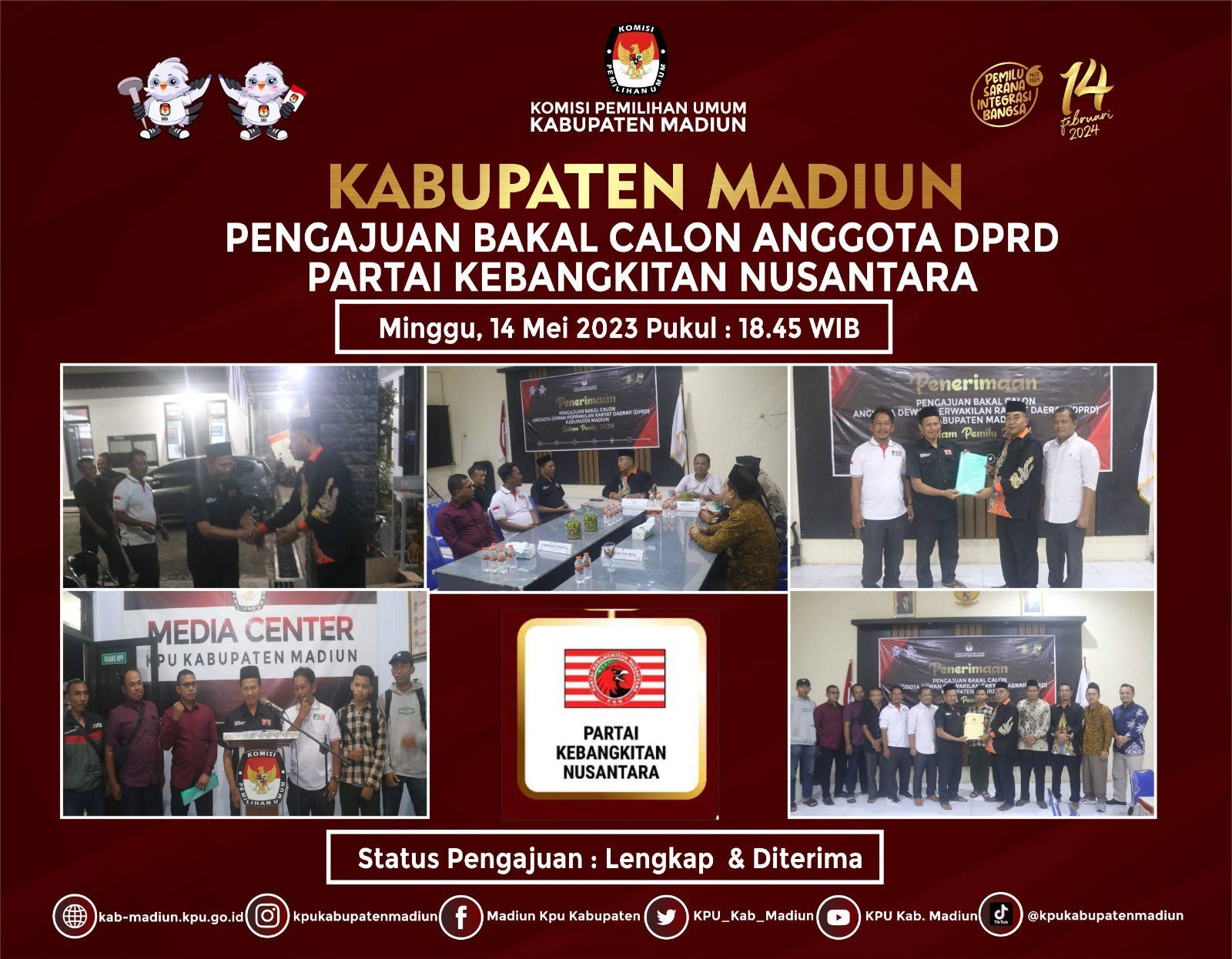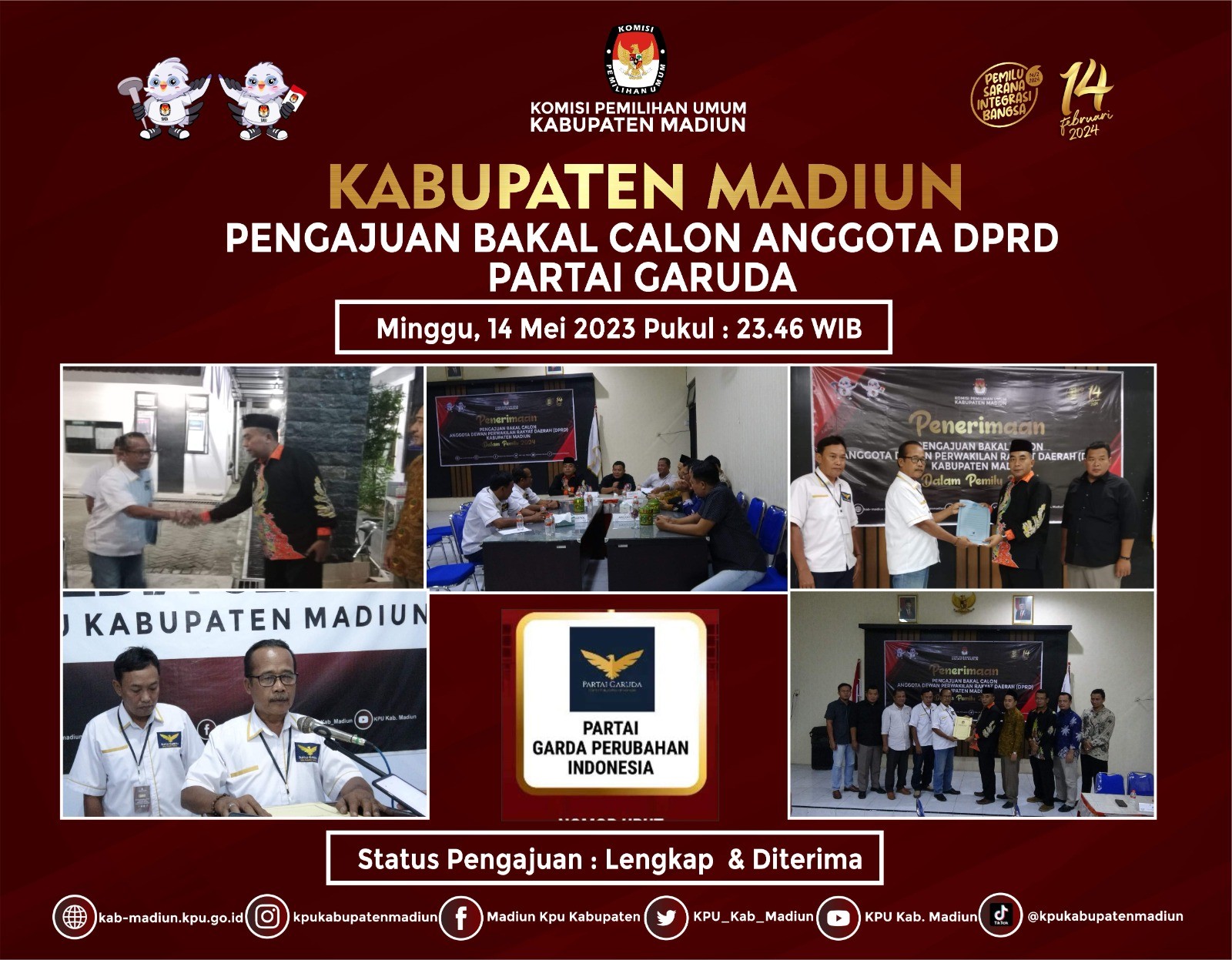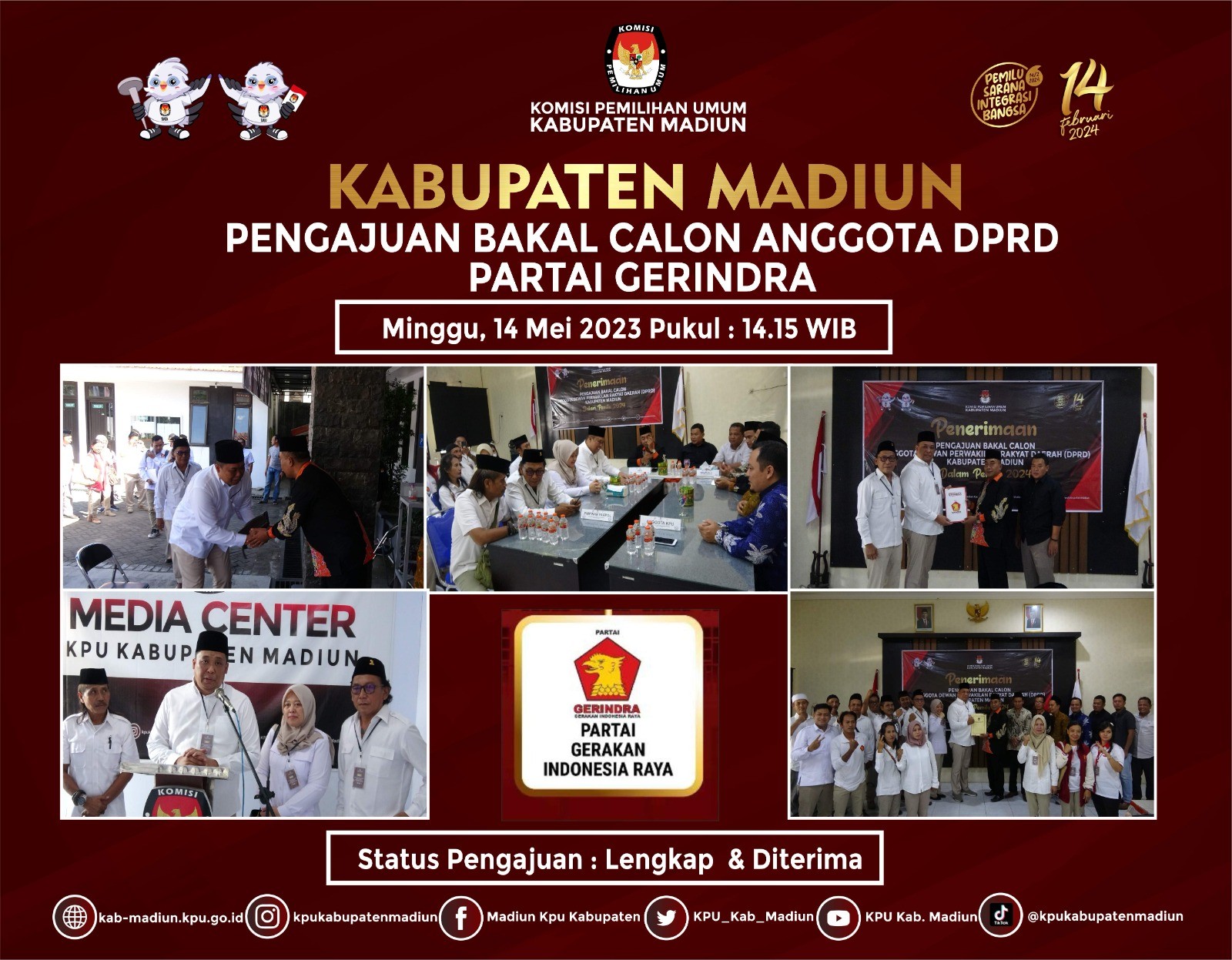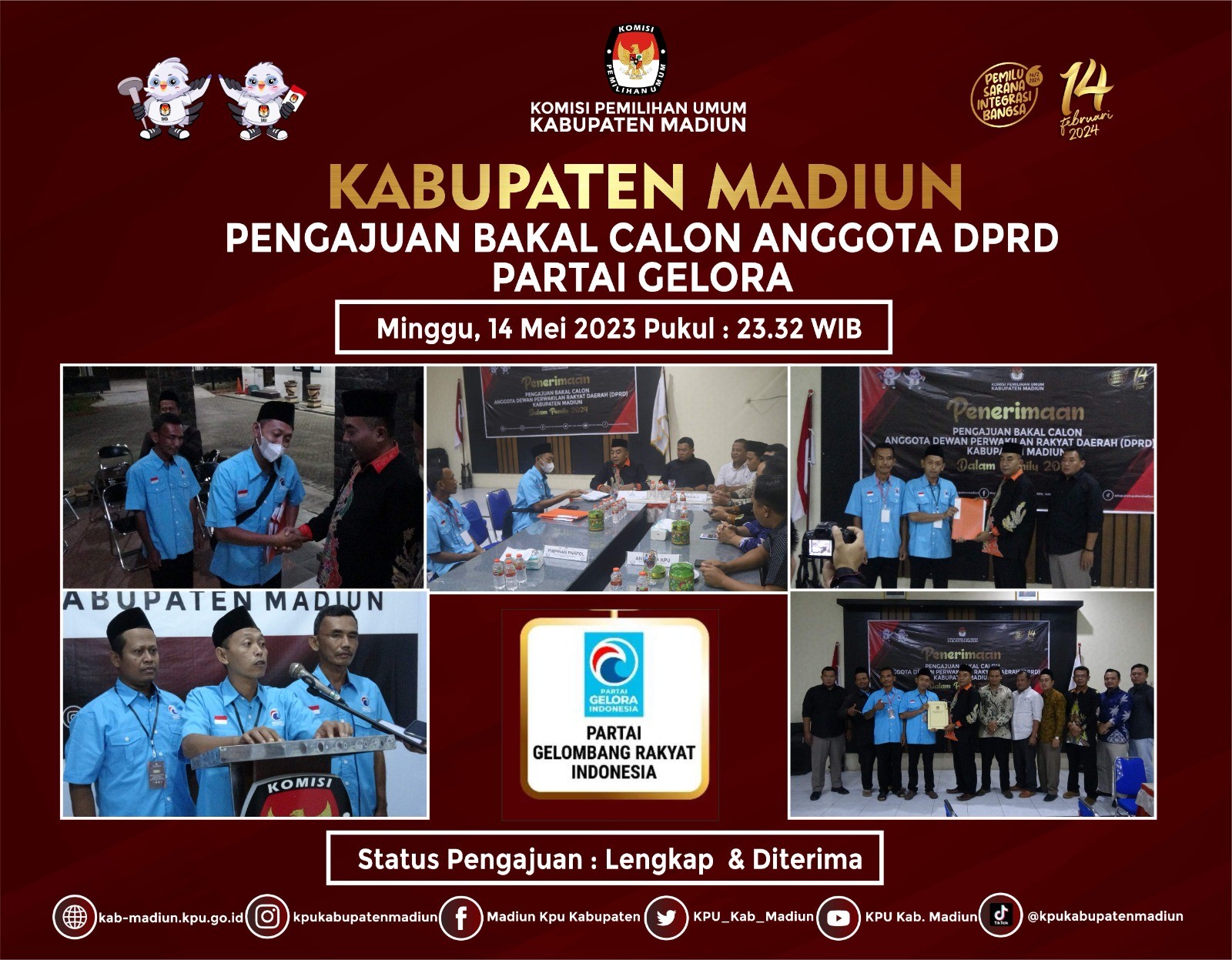 Madiun, http://kab-madiun.kpu.go.id Malam ini dihari terakhir 14 Mei 2023 Pukul 23.32 WIB DPD Partai Gelombang Rakyat Indonesia (Gelora Indonesia) melaksanakan pengajuan bakal calon DPRD Kabupaten Madiun. Dipimpin oleh Ketua DPD Partai Gelombang Rakyat Indonesia (Gelora Indonesia) Andri Suwarno datang ke Kantor KPU Kabupaten Madiun untuk mengajukan pendaftaran bakal calon DPRD Kabupaten Madiun. Kedatangan DPD Partai Gelombang Rakyat Indonesia (Gelora Indonesia) ditemui langsung oleh Ketua KPU Kabupaten Madiun Ali Nur Wahyudi dengan seluruh Anggota Komisioner ( Jumangin, Tri Haryono, Nur Wachid Nasrulloh, Fahim Amrillah). Dilakukan pengecekan data pada aplikasi SILON oleh operator berikut dilanjutkan dengan penyerahan BA ke DPD Partai Gelombang Rakyat Indonesia (Gelora Indonesia) sebagai tanda terima sudah mengajukan Bakal Calon DPRDnya ke KPU Kabupaten Madiun. Seluruh alur kegiatan pendaftaran ini juga didampingi dengan Bawaslu Kabupaten Madiun.