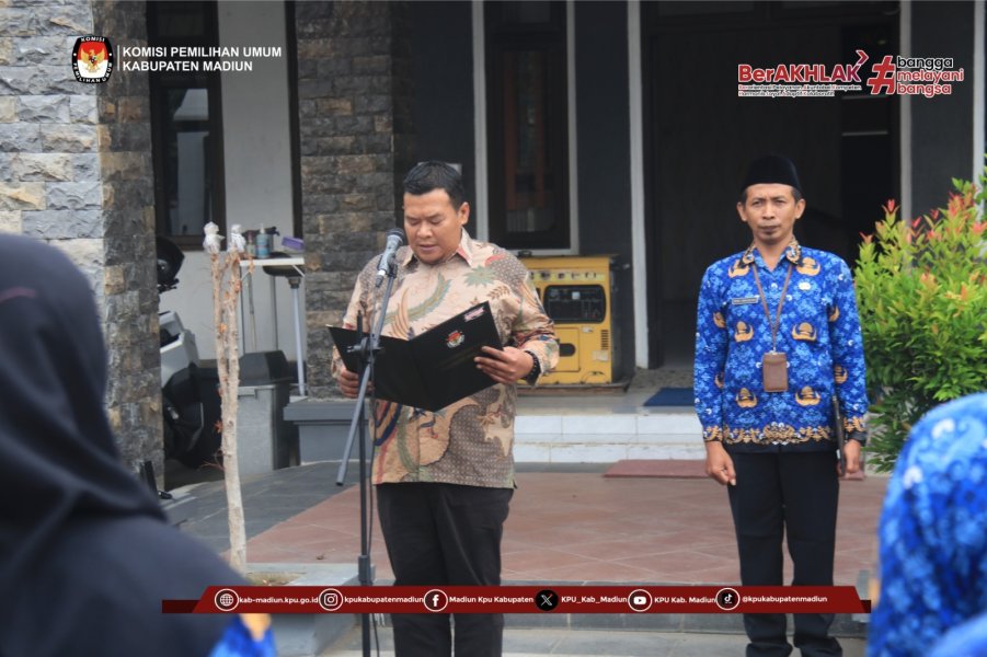 Madiun — Komisi Pemilihan Umum (KPU) Kabupaten Madiun melaksanakan Upacara Peringatan Hari Pahlawan Tahun 2025 di halaman kantor KPU Kabupaten Madiun pada Senin, 10 November 2025. Upacara berlangsung khidmat dan diikuti oleh seluruh anggota KPU, sekretaris, serta staf. Bertindak sebagai pembina upacara, Ketua KPU Kabupaten Madiun, Nur Anwar membacakan Amanat Menteri Sosial Republik Indonesia, Saifullah Yusuf, dalam rangka peringatan Hari Pahlawan Tahun 2025 yang mengusung tema “Pahlawanku Teladanku, Terus Bergerak, Melanjutkan Perjuangan.” Dalam amanat tersebut, Menteri Sosial mengajak seluruh masyarakat Indonesia untuk mengenang jasa para pahlawan bangsa yang telah berjuang tanpa pamrih demi kemerdekaan Indonesia. Para pahlawan disebut bukan hanya nama yang terukir di batu nisan, tetapi cahaya yang menerangi jalan generasi penerus bangsa hingga hari ini. Menteri Sosial menekankan tiga hal utama yang dapat diteladani dari para pahlawan bangsa. Pertama, kesabaran mereka dalam menempuh perjuangan dan membangun kebersamaan di tengah segala keterbatasan. Kedua, semangat untuk selalu mengutamakan kepentingan bangsa di atas segalanya, dengan terus mengabdi kepada rakyat tanpa pamrih. Ketiga, pandangan mereka yang jauh ke depan, berjuang demi generasi penerus bangsa serta menjadikan perjuangan sebagai bagian dari ibadah. Selain membacakan amanat Menteri Sosial, Ketua KPU Kabupaten Madiun juga menyampaikan pesan agar semangat perjuangan para pahlawan dapat diterapkan di lingkungan kerja KPU Kabupaten Madiun. Beliau menegaskan pentingnya meneladani nilai-nilai kepahlawanan dalam menjalankan tugas penyelenggaraan pemilu, terutama dalam hal integritas, tanggung jawab, dan semangat pengabdian kepada bangsa dan negara. Suasana Upacara Hari Pahlawan di Halaman Kantor KPU Kab. Madiun Melalui momentum Hari Pahlawan 2025 ini, keluarga besar KPU Kabupaten Madiun berkomitmen untuk terus meneladani semangat juang para pahlawan dengan bekerja sepenuh hati, menjaga profesionalitas, dan memberikan pelayanan terbaik kepada masyarakat. Sebagai penutup, seluruh peserta melaksanakan doa bersama untuk para pahlawan bangsa serta bertekad untuk terus menjaga semangat perjuangan dalam mengabdi kepada demokrasi Indonesia. Penulis: Anissa Editor: Endy