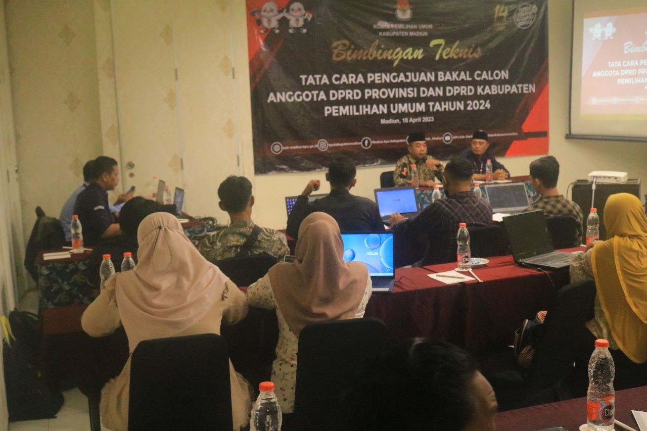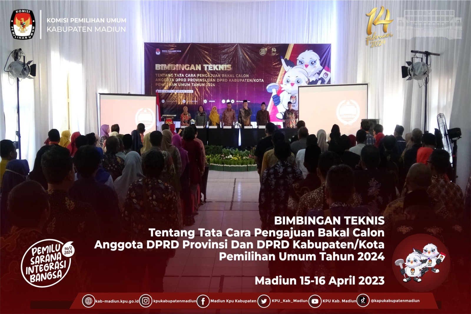 Madiun, http://kab-madiun.kpu.go.id KPU Provinsi Jawa Timur adakan kegiatan Bimbingan Teknis yang turut mengundang seluruh Satker KPU se-Jawa Timur. kali ini KPU Kabupaten Madiun di berikan mandat untuk menyediakan tempat dalam pelaksanaan Bimbingan Teknis yang dimulai tanggal 15-16 April 2023. Pelaksanaan Kegiatan ini dalam rangka Bimbingan Teknis Tentang Tata Cara Pengajuan Bakal Calon Anggota DPRD Provinsi dan Anggota DPRD Kabupaten / Kota untuk pemilihan Tahun 2024.