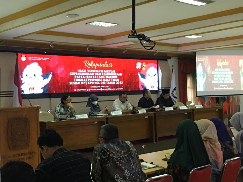 Madiun, http://kab-madiun.kpu.go.id Bertempat di Aula KPU Provinsi Jawa Timur, Rekapitulasi Hasil Verifikasi Faktual Kepengurusan dan Keanggotaan Partai Prima Sesuai Keputusan KPU No. 210 Tahun 2023 tingkat Provinsi Jawa Timur dibuka oleh Ketua KPU Provinsi Jawa Timur, Choirul Anam. Kegiatan tapat pleno rekapitulasi tersebut hadir Komisioner KPU Provinsi Jawa Timur, Bawaslu Provinsi Jawa Timur, Pengurus Partai Prima Jawa Timur, Divisi Teknis dan Kasubag Tekmas 29 Kabupaten/Kota se Jawa Timur yang terdapat kepengurusan Partai Prima. Rapat rekapitulasi dilanjut dengan dipimpin oleh Komisioner KPU Provinsi Jatim Divisi Teknis, Insan Qoriyawan.