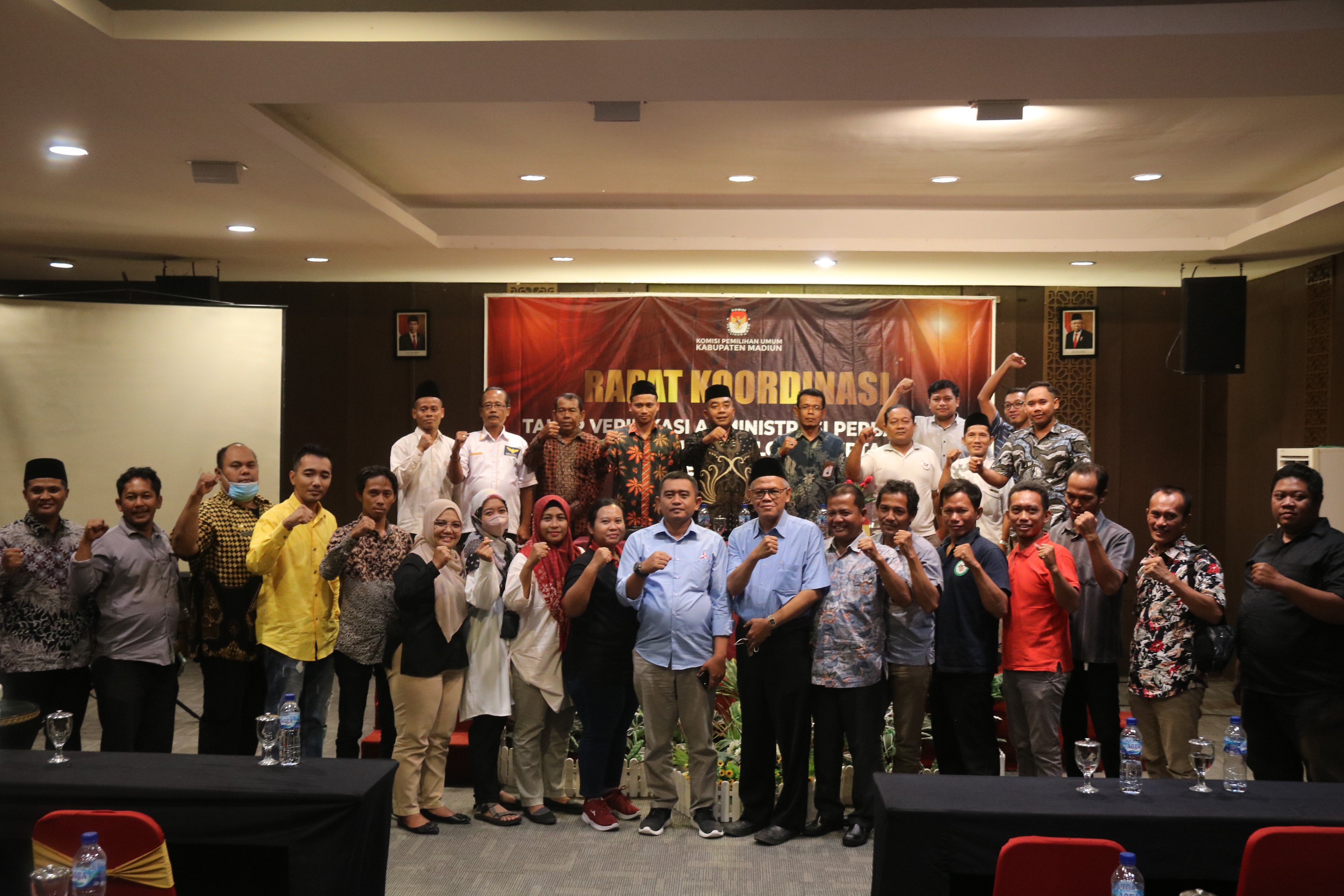 Madiun, http://kab-madiun.kpu.go.id Jum’at 23 September 2022 pukul 13.00 WIB KPU Kabupaten Madiun laksanakan kegiatan Rapat Koordinasi Tahap Verifikasi Administrasi Perbaikan Partai Politik Calon Peserta Pemilu tahun 2024. Turut mengundang Perwakilan dari Bawaslu Kabupaten Madiun dan Seluruh Ketua bersama LO dari Partai politik sebagai peserta dalam kegiatan tersebut. Ketua KPU Kabupaten Madiun Ali Nur Wahyudi mengisi sambutannya di awal kegiatan ini dilaksanakan. Didampingi oleh Komisioner Divisi Teknis Penyelenggaraan Jumangin dan Komisioner Divisi Hukum dan Pengawasan Tri Haryono. Kegiatan Rakor yang bertempat di Ruang Rapat Iclub Kota Madiun ini dilaksanakan dengan tujuan pada Tahapan Verifikasi Administrasi Perbaikan ini mengerti dan memahami terkait pelaksanaan tindak lanjut berikutnya yang harus dilaksanakan seluruh pihak partai Politik. Komisioner Divisi Teknis Penyelenggaraan Jumangin selaku pemateri dalam kegiatan rakor tersebut, memaparkan seluruh materi , beserta alur setelah tindak lanjut verifikasi administrasi yang lalu. Kegiatan Rakor ini diakhiri dengan diskusi bersama dengan partai politik.