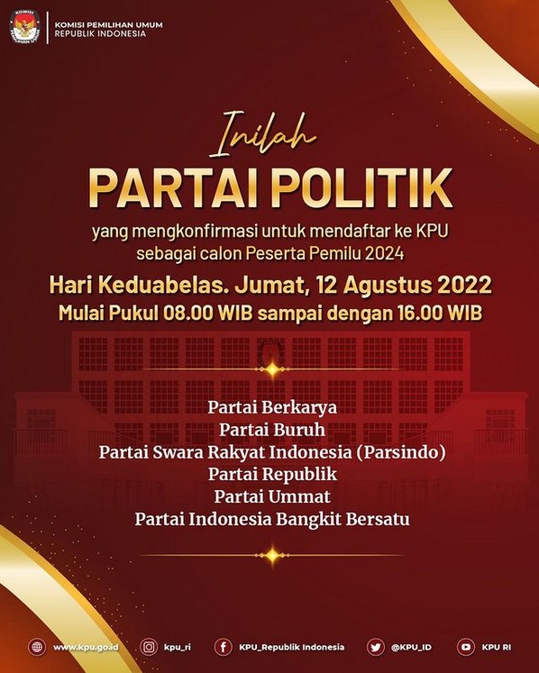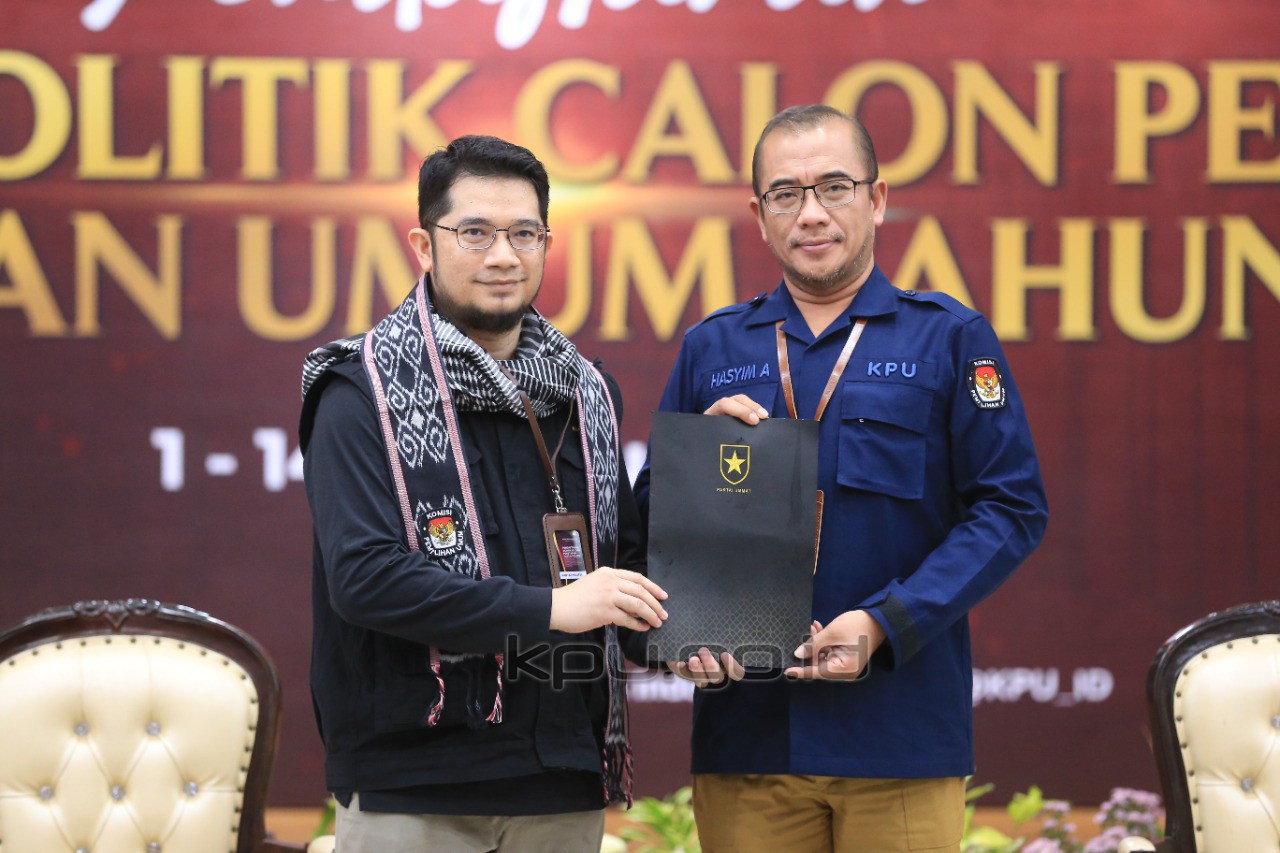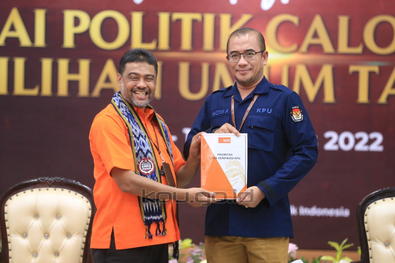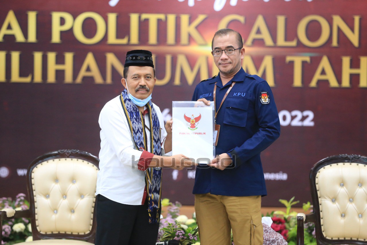 Jakarta, kpu.go.id - Partai Ummat mendaftar sebagai Partai Politik Calon Peserta Pemilu Tahun 2024, Jumat (12/8/2022) di kantor KPU. Pendaftaran dilakukan oleh Ketua Majelis Syura Amien Rais, didampingi Ketua Umum DPP Partai Ummat Ridho Rahmadi, dan Sekretaris Jenderal DPP Partai Ummat Muhajir pada pukul 15.25 WIB. Delegasi partai disambut oleh Sekretaris Jenderal KPU Bernad Dermawan Sutrisno, didampingi Deputi Bidang Dukungan Teknis Eberta Kawima di lantai dasar (lobby) Gedung KPU, dan diterima oleh Ketua KPU Hasyim Asy'ari, Anggota KPU Idham Holik, Mochammad Afifuddin, August Mellaz, Betty Epsilon Idroos, Yulianto Sudrajat, dan Parsadaan Harahap, serta disaksikan oleh Bawaslu dan pemantau pemilu di Ruang Rapat Utama Gedung KPU. Turut hadir dari Partai Ummat di Ruang Rapat Utama Gedung KPU, Wakil Ketua Umum Chandra Tirta Wijaya, Wakil Ketua Umum Nazaruddin, Wakil Ketua Umum Hi. Benny Suharto, Wakil Ketua Majelis Syura MS. Kaban, Wakil Ketua Majelis Syura Thalib Aljufri, Sekretaris Majelis Syura Idrus Sambo, Ketua Bidang Perempuan dan Keluarga Euis Fatayati, Petugas Penghubung Imam Bayu Prasetyo, Petugas Penghubung Hizriyanda Putra, serta dari KPU jajaran pejabat eselon II Setjen KPU RI. (Humas KPU)