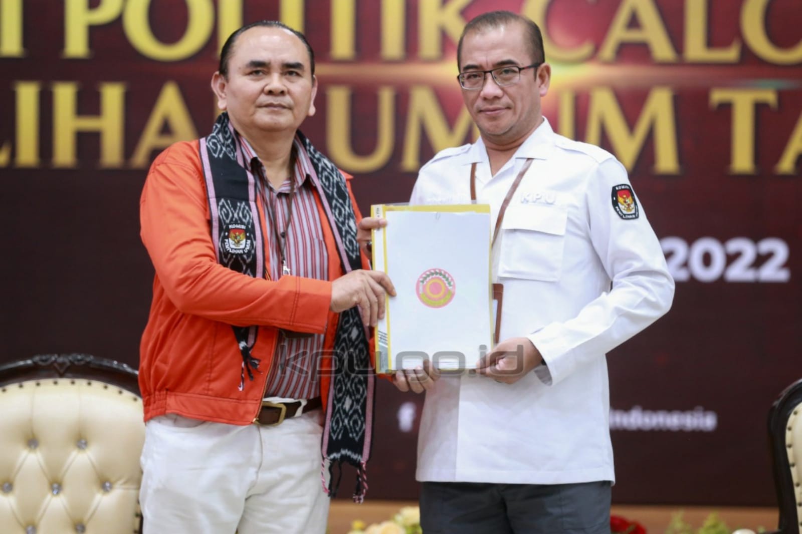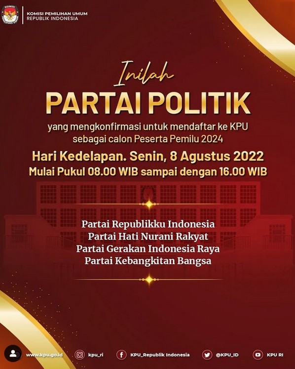 Jakarta, kpu.go.id - Partai Gerakan Indonesia Raya (Gerindra) mendaftar sebagai Partai Politik Calon Peserta Pemilu Tahun 2024, Senin (8/8/2022) di kantor KPU. Pendaftaran dilakukan oleh Ketua Umum Partai Gerindra Prabowo Subianto didampingi Sekretaris Jenderal Ahmad Muzani, dan Bendahara Umum Thomas A.M. Djiwandono pada pukul 15.20 WIB. Delegasi partai disambut oleh Sekretaris Jenderal KPU Bernad Dermawan Sutrisno, didampingi Deputi Bidang Dukungan Teknis Eberta Kawima di lantai dasar (lobby) Gedung KPU, dan diterima oleh Ketua KPU Hasyim Asy'ari, Anggota KPU Idham Holik, August Mellaz, Mochammad Afifuddin, Betty Epsilon Idroos, Yulianto Sudrajat dan Parsadaan Harahap, serta disaksikan oleh Bawaslu dan pemantau pemilu. Turut hadir dari Partai Gerindra di Ruang Rapat Utama Gedung KPU, Ketua Harian Sufmi Dasco Ahmad, Wakil Ketua Umum Sugiono, Anggota Dewan Pembina Prasetyo Hadi, Wakil Ketua Umum Musa Bangun, Wakil Ketua Umum Putih Sari, Wakil Ketua Umum Habiburokhman, Anggota Dewan Pembina Himmatul Aliyah, dan Anggota Dewan Pembina Novita Wijayanti. (Humas KPU).