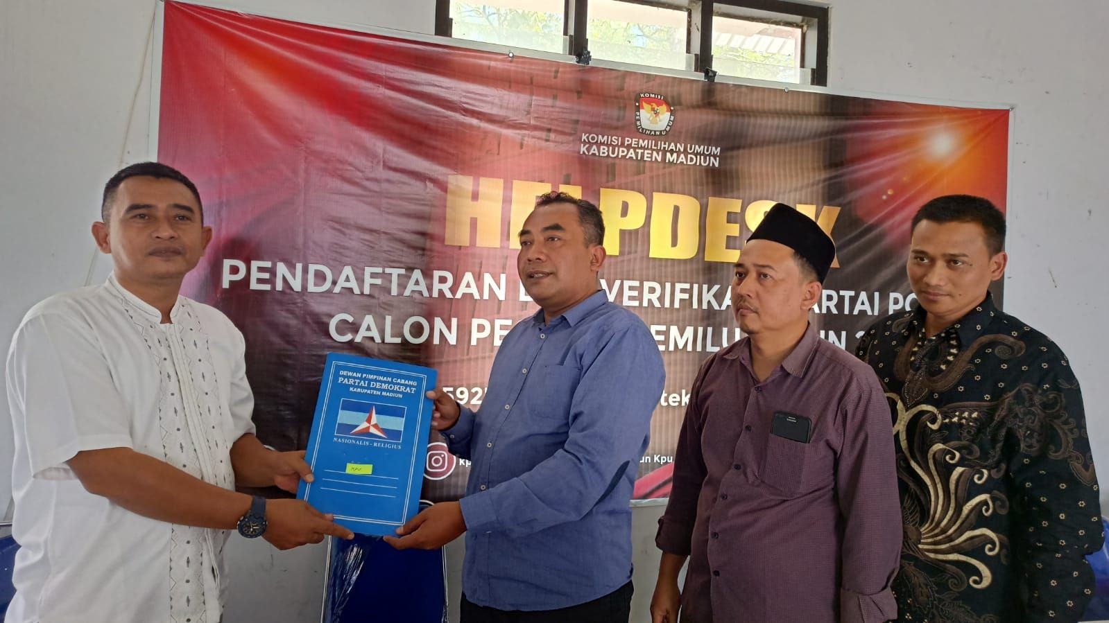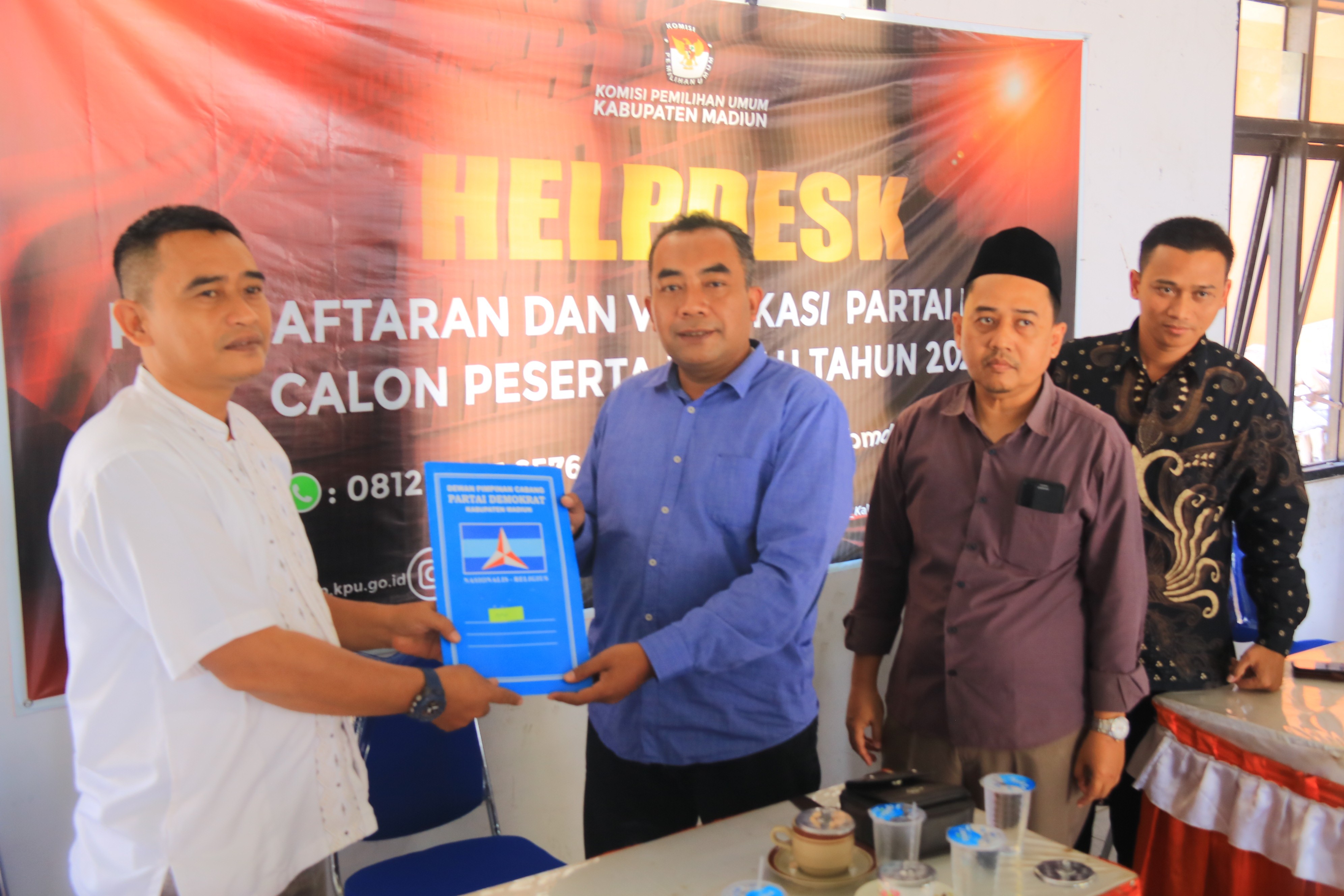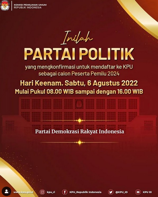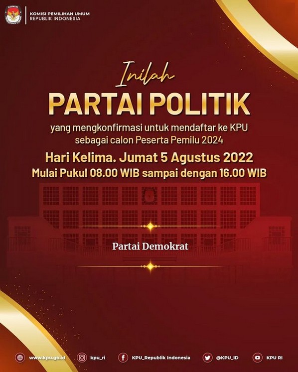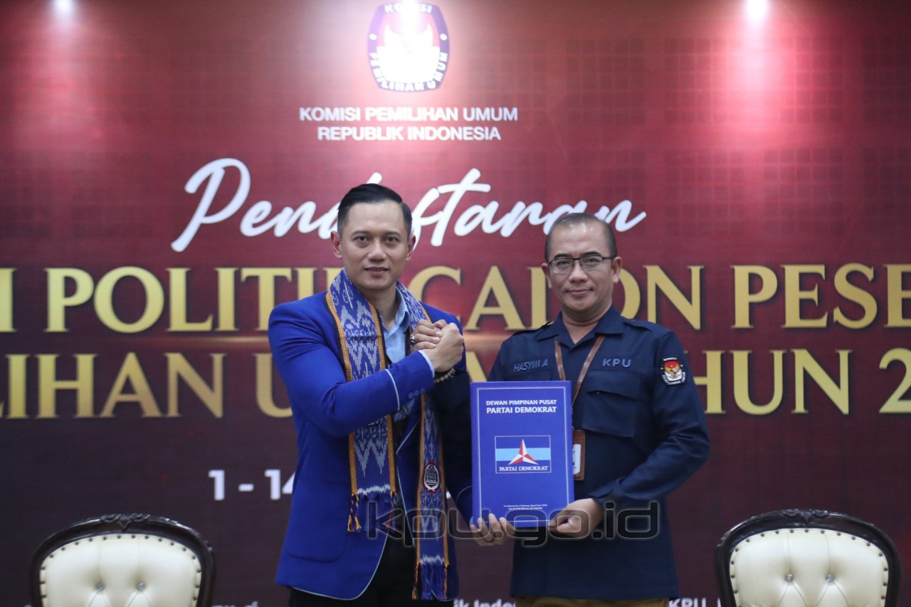 Jakarta, kpu.go.id - Partai Demorkat mendaftar sebagai Partai Politik Calon Peserta Pemilu Tahun 2024, Jumat (5/8/2022) di kantor KPU. Pendaftaran dilakukan oleh Ketua Umum Agus Harimurti Yudhoyono didampingi Sekjen Teuku Riefky Harsya dan Wakil Ketua Umum Edhie Baskoro Yudhoyono, pada pukul 13.59 WIB. Delegasi partai disambut oleh Sekretaris Jenderal KPU Bernad Dermawan Sutrisno, didampingi Deputi Bidang Dukungan Teknis Eberta Kawima di lantai dasar (lobby) Gedung KPU, dan diterima oleh Ketua KPU Hasyim Asy'ari, Anggota KPU Idham Holik, August Mellaz, Mochammad Afifuddin, Betty Epsilon Idroos, Yulianto Sudrajat dan Parsadaan Harahap, serta disaksikan oleh pemantau pemilu di Ruang Rapat Utama Gedung KPU. Turut hadir dari Partai Demokrat di Ruang Rapat Utama Gedung KPU, Kasatgas Verpol Andi Timo Pangerang, Wakil Kasatgas Verpol Sigit Raditya, Sekretaris Satgas Verpol Daisy Margaret Silanno, Penanggung Jawab Verpol Andi Arief, Penanggung Jawab Verpol H.E. Herman Khaeron, Wakil Komisi II DPR RI Fraksi Partai Demokrat Anwar Hafid, Narahubung (liaison officer) Andi Nurpati Pangerang, Narahubung (liaison officer) Irawan S. Leksono. (Humas KPU)