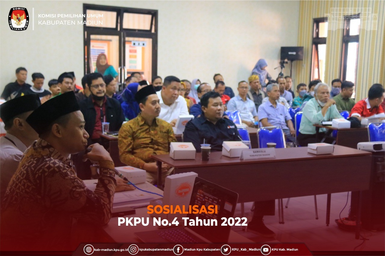 Madiun, http://kab-madiun.kpu.go.id Siang ini, mulai pukul 13.00 WIB KPU Kabupaten Madiun melaksanakan kegiatan Sosialisasi Tahapan Pemilu Serentak tahun 2024. Pelaksanaan kegiatan ini dibungkus dalam bentuk Sosialisasi Peraturan KPU No. 4 tentang pendaftaran, verifikasi dan penetapan Partai Politik Peserta Pemilu serta pengenalan dan fungsi sistem informasi partai politik (SIPOL). Seluruh Partai Politik yang ada di Kabupaten Madiun, Bawaslu Kabupaten Madiun, serta Bakesbang turut hadir dalam kegiatan ini.