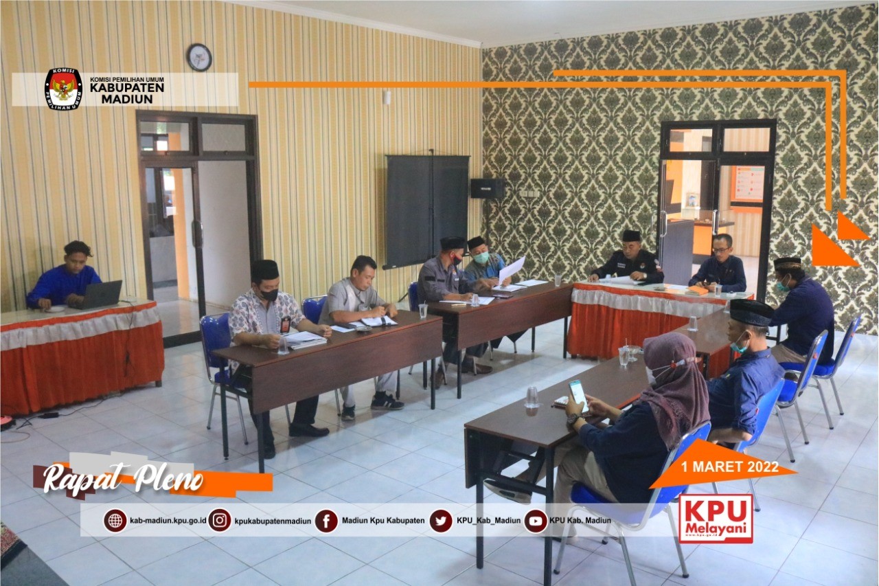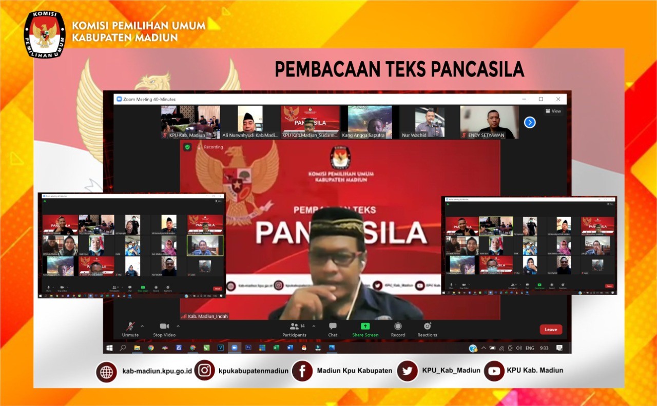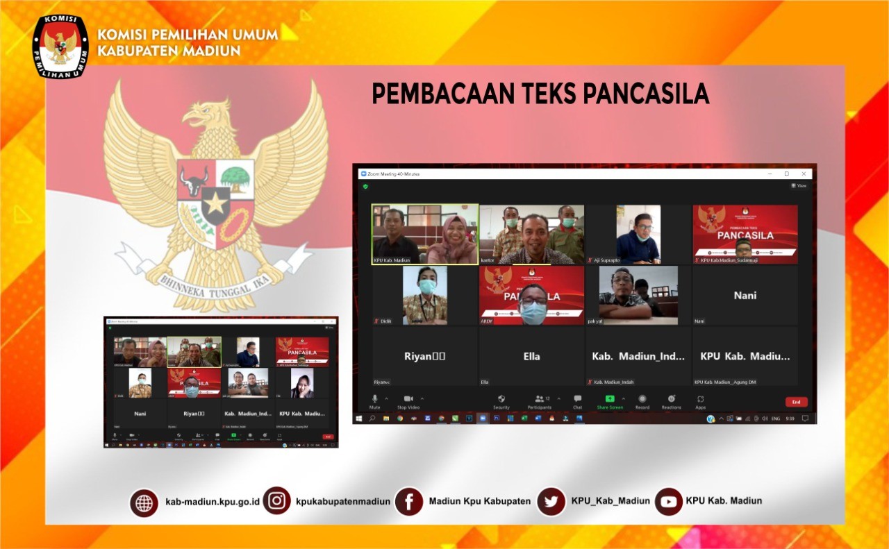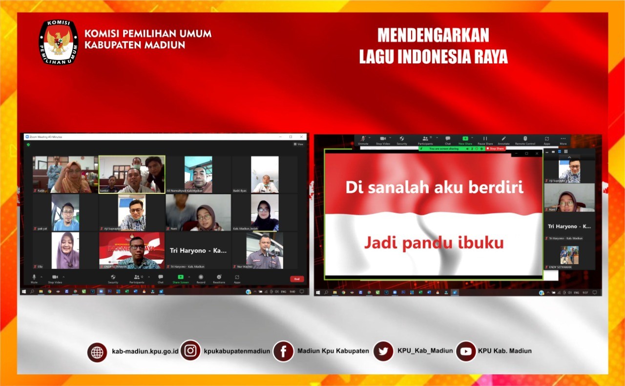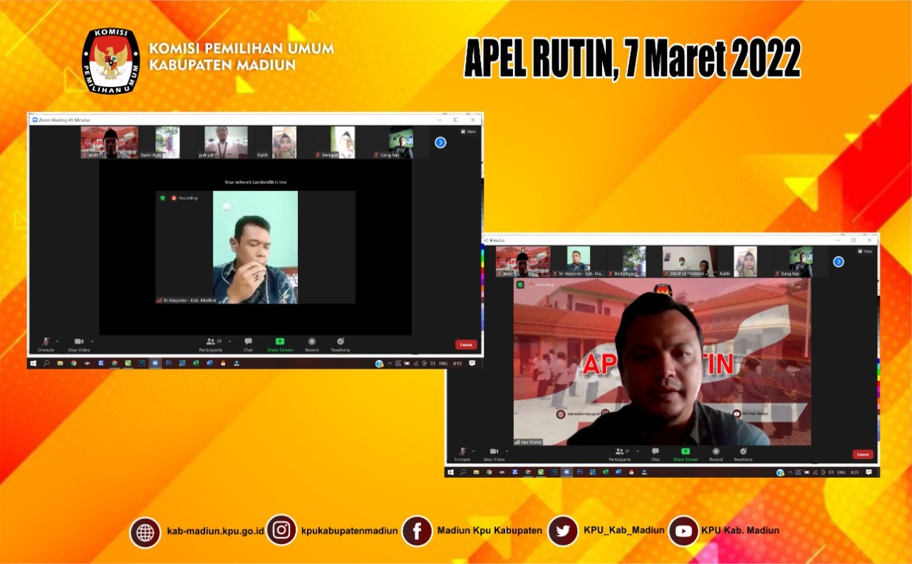 Madiun, http://kab-madiun.kpu.go.id "Mari saling menjaga sinergitas untuk memasuki tahapan pemilu serentak 2024" ujar Komisioner Divisi Hukum dan Pengawasan Tri Haryono saat memimpin Apel Rutin Hari Senin. Kali ini Apel Rutin dilaksanakan secara Daring yang dimulai pukul 09.00 WIB dan dihadiri oleh seluruh personel KPU Kabupaten Madiun baik yang sedang laksanakan WFH maupun WFO. Dalam Amanatnya Tri menyampaikan bahwasannya KPU Kabupaten Madiun sebagai Satker Penyelenggara Pemilu untuk lebih mempersiapkan seluruh kebutuhan Pemilu , karena Pemilu Serentak 2024 ini akan berbeda dengan Pemilu yang dilaksanakan tahun 2019 kemarin. walaupun ada wacana terkait diundurnya Pemilu 2024, namun sampai saat ini masih sekedar wacana , yang pasti kita sebagai satker penyelenggara pemilu harus tetap mematuhi aturan yang sudah ditetapkan. Tri menambahkan bahwasanya pentingnya kesiapan untuk saling evaluasi dan instrospeksi diri serta tetap menjaga komunikasi segala kesulitan apapun nantinya akan bisa diselesaikan.
