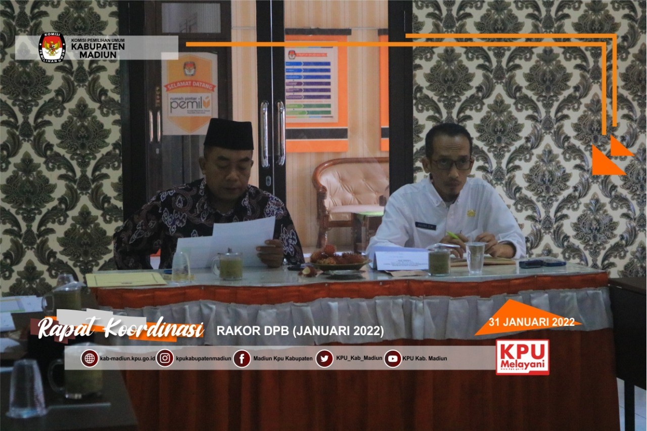 Dalam Rakor ini penyampaian Laporan Rekapitulasi DPB bulan Januari tahun 2022 ini disampaikan oleh Komisioner Divisi Perencanaan Data Dan Informasi Nur Wachid Nasrulloh dengan perolehan hasil total 571.858 pemilih, dengan rincian jumlah pemilih laki laki 278,649 pemilih dan jumlah pemilih perempuan 293,209 pemilih. Dalam kegiatan ini turut hadir dari Seluruh Komisioner lainnya, Sekretaris dan Seluruh Sub Koordinator Bagian dengan hasil Rapat yakni Menerima dan Menyepakati Penyampaikan Laporan Rekapitulasi DPB Bulan Januari tahun 2022.