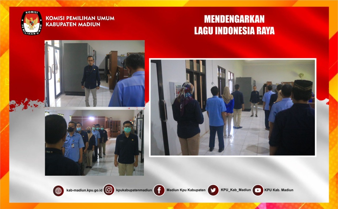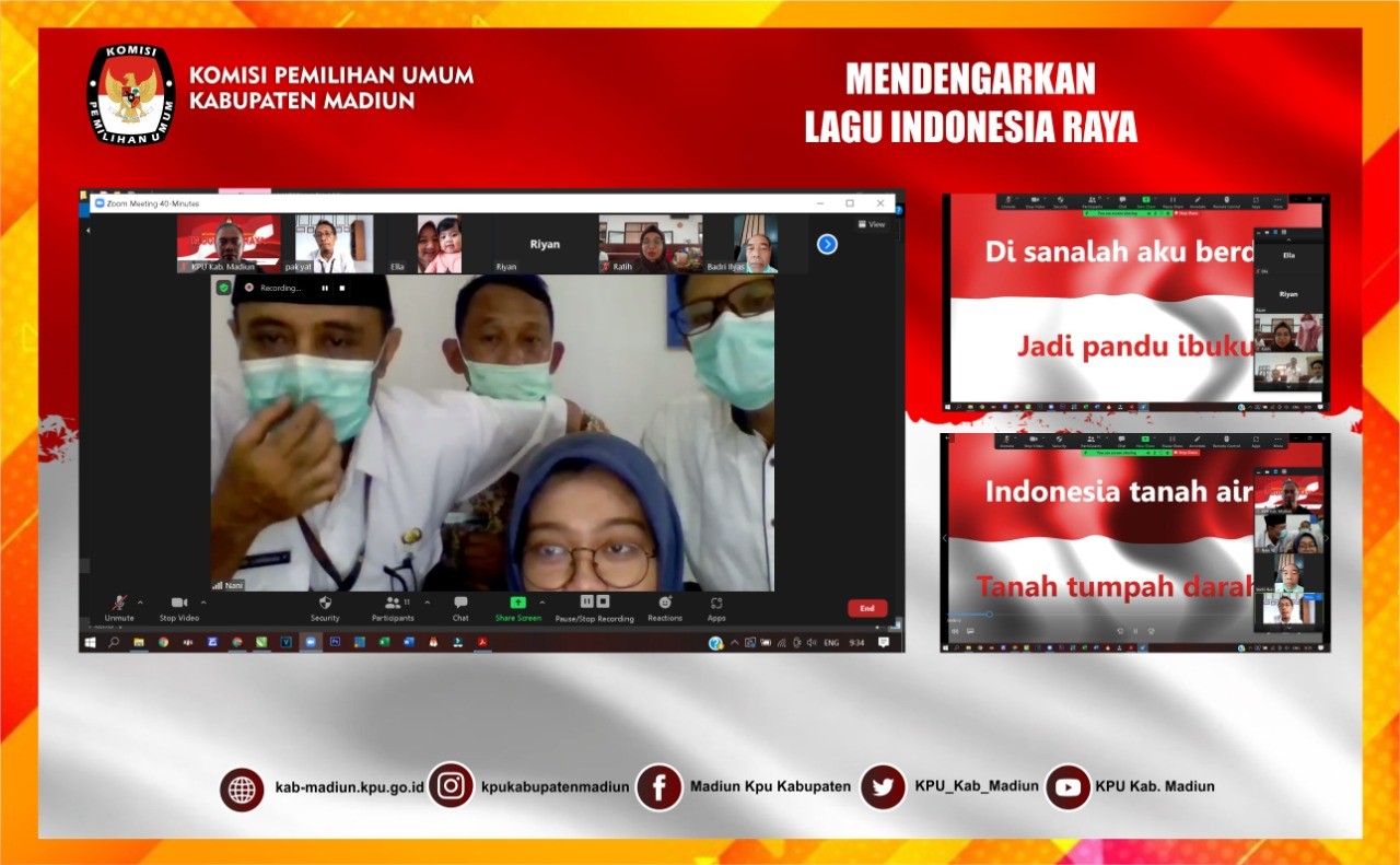 Madiun, http://kab-madiun.kpu.go.id Pagi ini, Seluruh Komisioner dan Staf Sekretariat KPU Kabupaten Madiun Laksanakan Rutinitas sebelum mengawali kegiatan. Rutinitas tersebut yakni Bersama -sama Mendengarkan Lagu Indonesia Raya yang kali ini dipimpin oleh Sub Koordinator Bagian Hukum Pujo Lambang Pamungkas. Beliau menyampaikan kepada seluruh personel KPU Kabupaten Madiun untuk tetap semangat dan bertanggung jawab terhadap tugas yang diberikan, serta memperkuat kompakan antar personel. Dikarenakan ada staf personel KPU Kabupaten Madiun yang sedang menjalankan WFH dan WFO, Kegiatan rutin ini dilaksanakan via Zoom Meeting yang dimulai pukul 09.30 WIB.