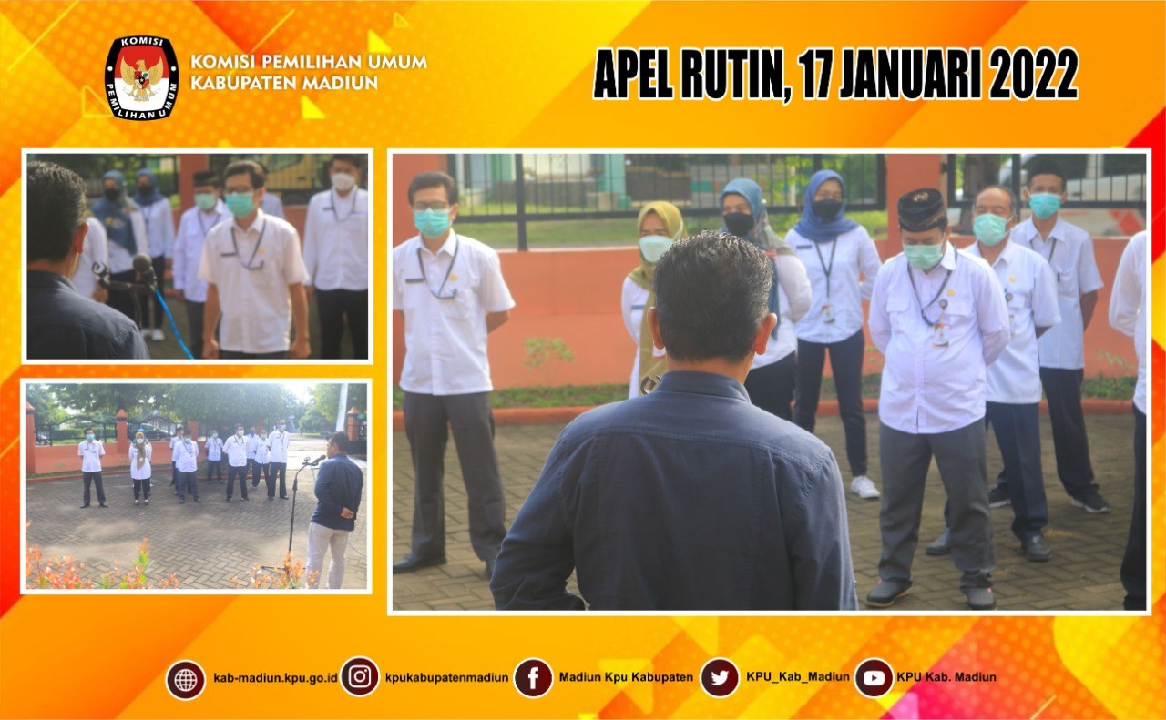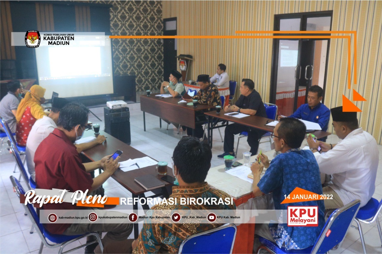 Madiun, http://kab-madiun.kpu.go.id Komisi Pemilihan Umum Kabupaten Madiun laksanakan Rapat Pleno dalam rangka membahas Instruksi Menteri Dalam Negeri No, 3 Tahun 2022 tentang Pemberlakuan Pembatasan Kegiatan Masyarakat Level 3, Level 2, dan Level 1 Corona Virus Disease 2019 di Wilayah Jawa dan Bali.Di pimpin oleh Ketua KPU Kabupaten Madiun Ali Nur Wahyudi di ikuti peserta seluruh Komisioner lainnya, Sekretaris Serta Seluruh Sub Koordinator Bagian. Dalam Rapt Pleno ini diputuskan untuk pelaksanaan kegiatan perkantoran dengan dibagi menjadi WFH 25% dan WFO 75% yang sesuai dengan SE KPU RI dan Inmendagri no 3 tahun 2022, namun dengan catatan tetap laksanakan Protokol Kesehatan yang berlaku sebab diwilayah Kabupaten Madiun walaupun sudah masuk kategori level 1, ada virus varian lain yang juga sudah masuk di wilayah kabupaten madiun. Ali menghimbau kepada seluruh personel KPU Kabupaten Madiun untuk tetap menjaga kesehatan baik di lingkungan kantor maupun di lingkungannya masing masing.