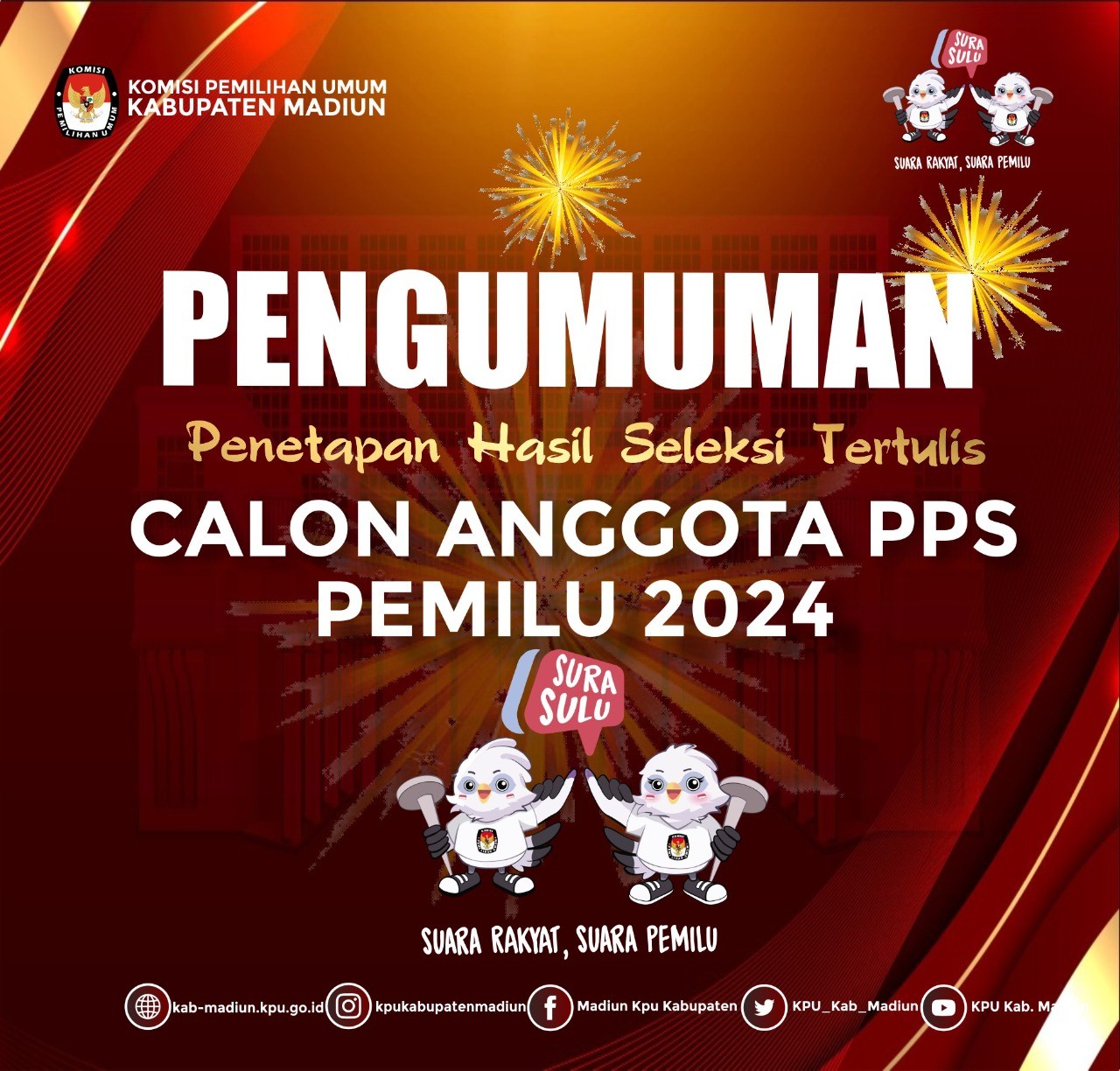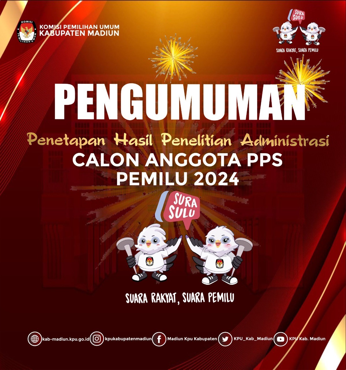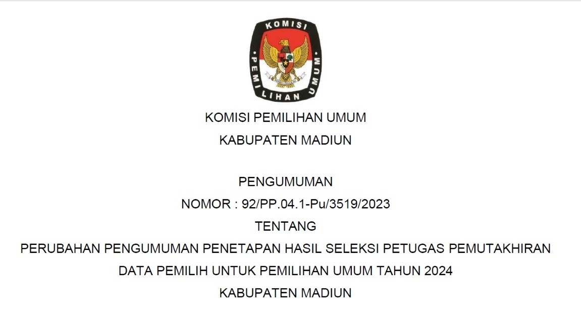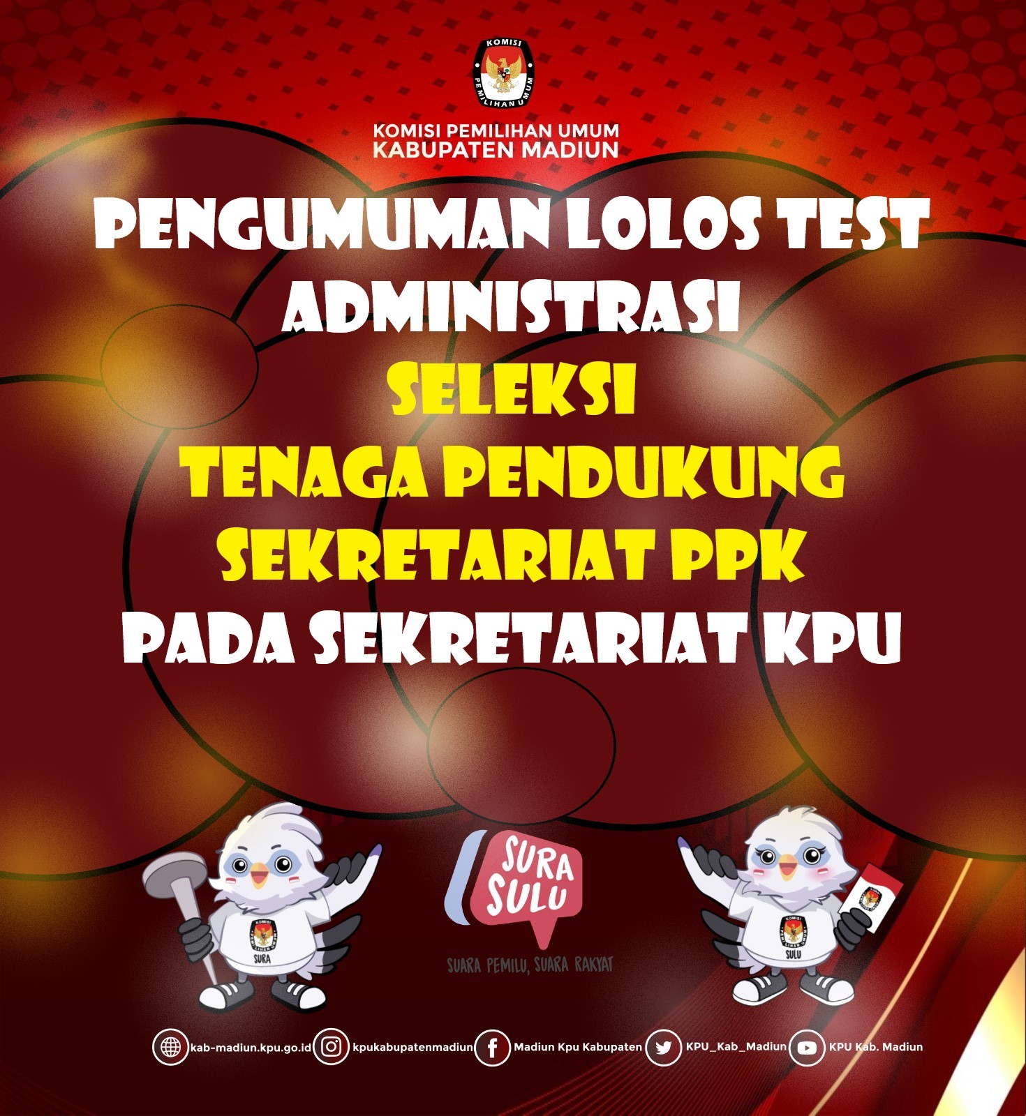 Madiun, http://kab-madiun.kpu.go.id Pengumuman Lolos Test Administrasi dalam rangka seleksi Tenaga Pendukung Sekretariat Panitia Pemilihan Kecamatan (PPK) pada Sekretariat KPU Kabupaten Madiun. Bahwasannya yang dinyatakan Lulus Seleksi Administrasi untuk selanjutnya dapat mengikut tes Seleksi Wawancara, dengan membawa berkas Hardcopy dan Kartu Tanda Penduduk (KTP) asli pada Hari Senin 6 Maret 2023 yang dilaksanakan di Kantor KPU Kabupaten Madiun Jalan Raya Madiun- Ponorogo no. 46 Kecamatan Geger Kabupaten Madiun.