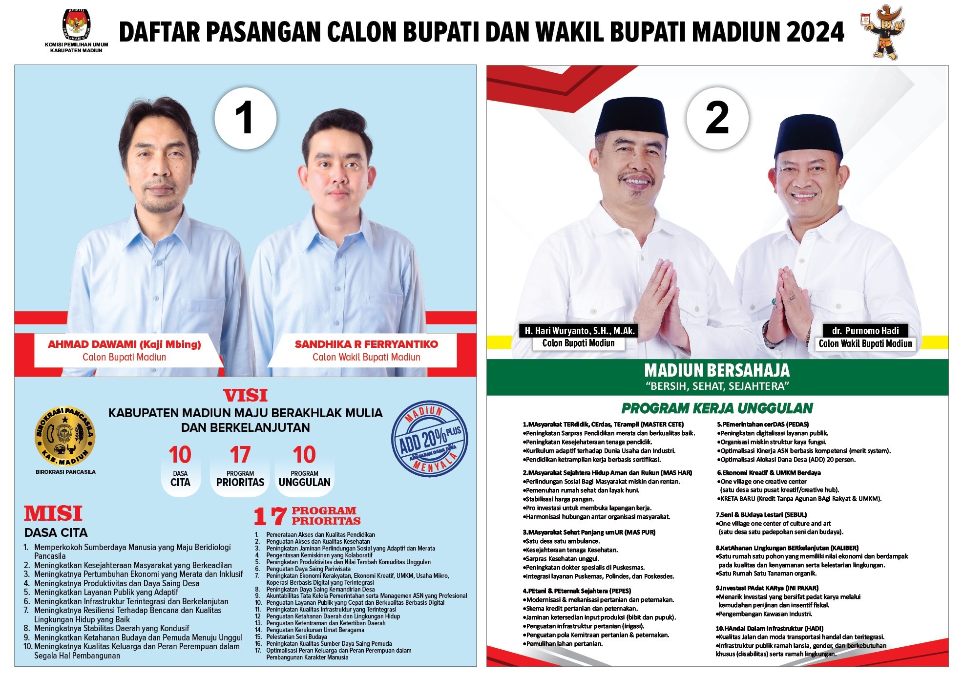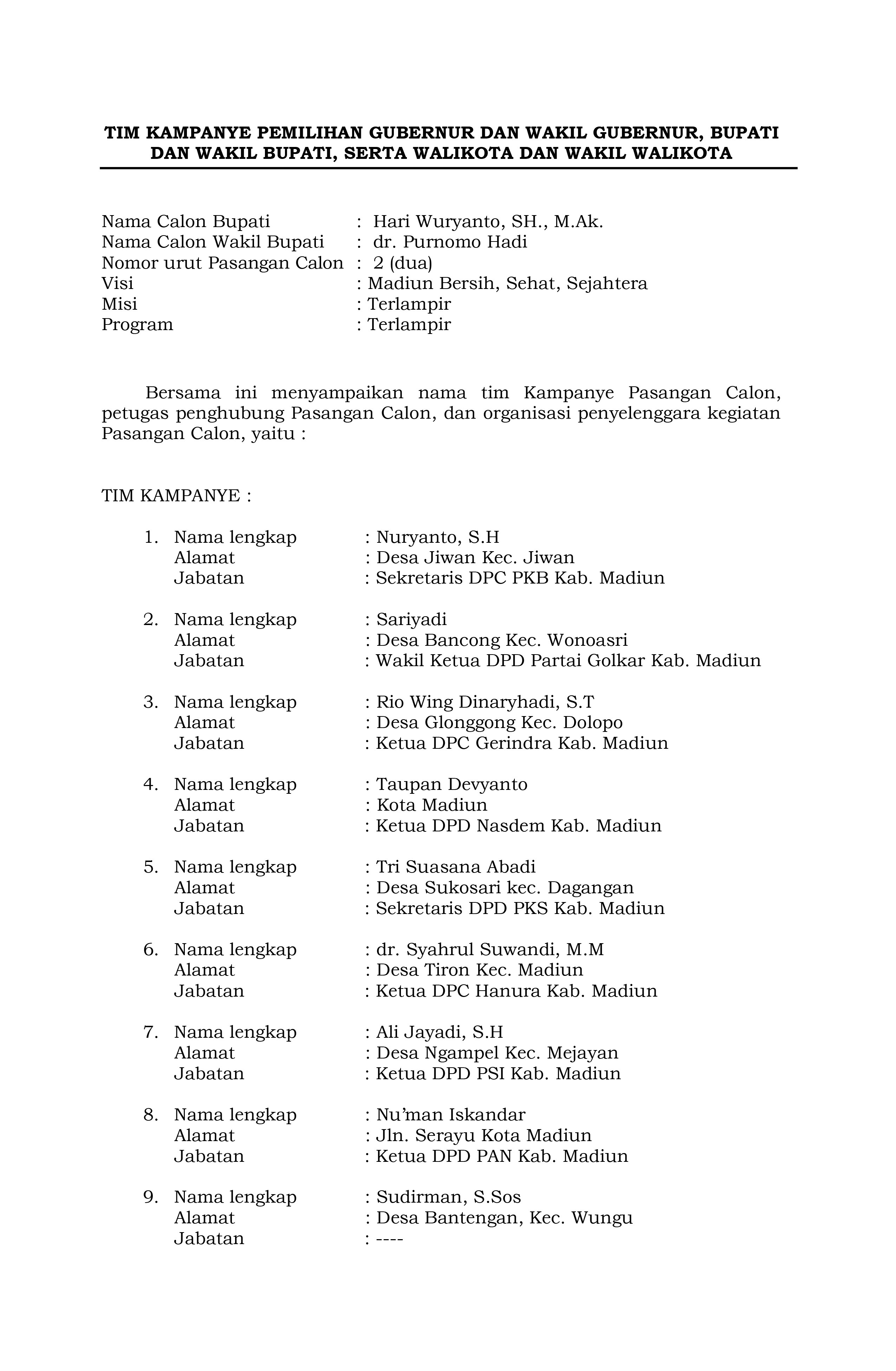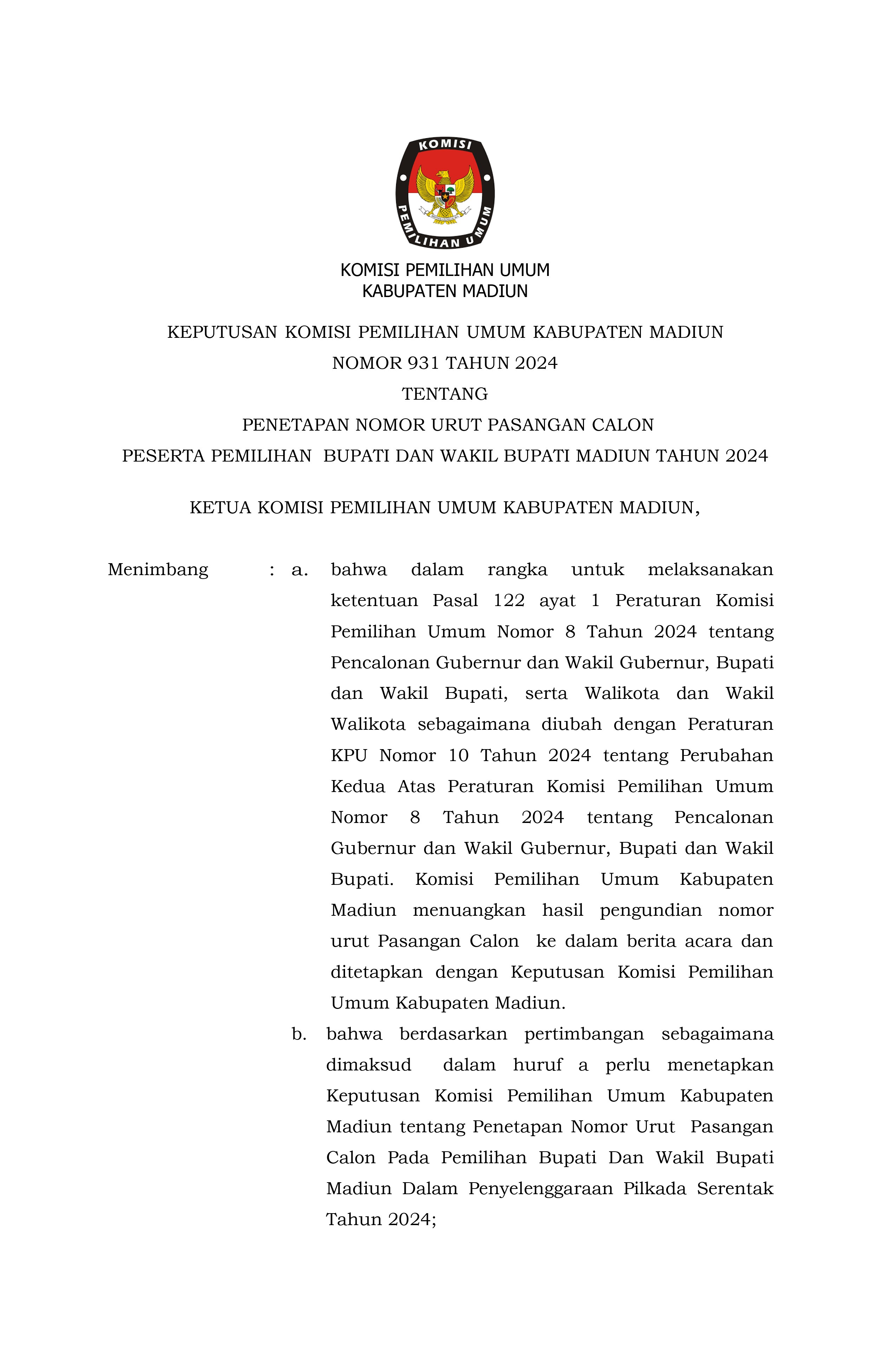 KPU Kabupaten Madiun telah mengeluarkan SK tentang Penetapan Nomor Urut Pasangan Calon Bupati dan Wakil Bupati Madiun