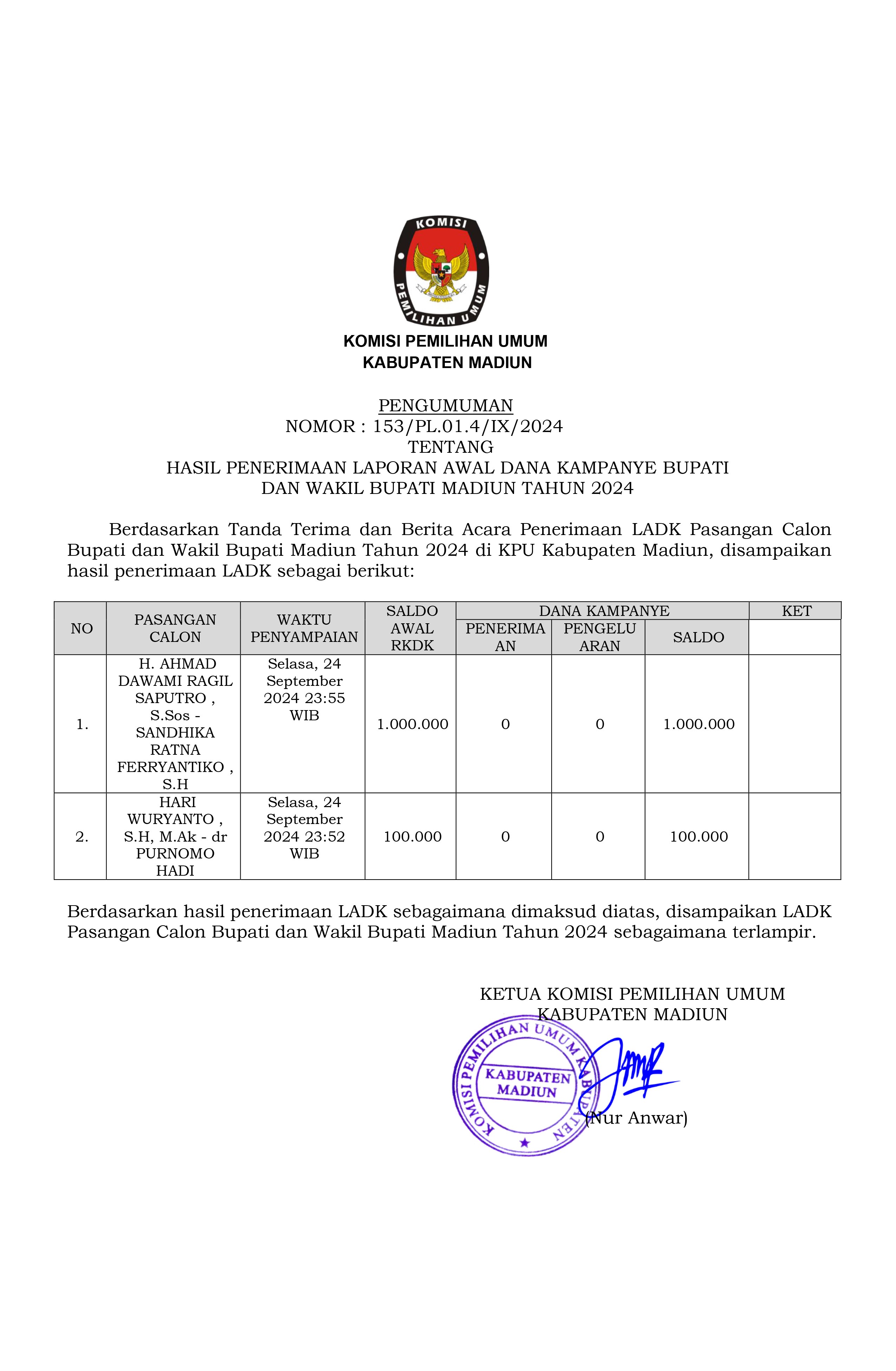 KPU Kabupaten Madiun telah mengeluarkan SK KPU Kabupaten Madiun tentang Penetapan Pasangan Calon Bupati dan Wakil Bupati Madiun Tahun 2024.